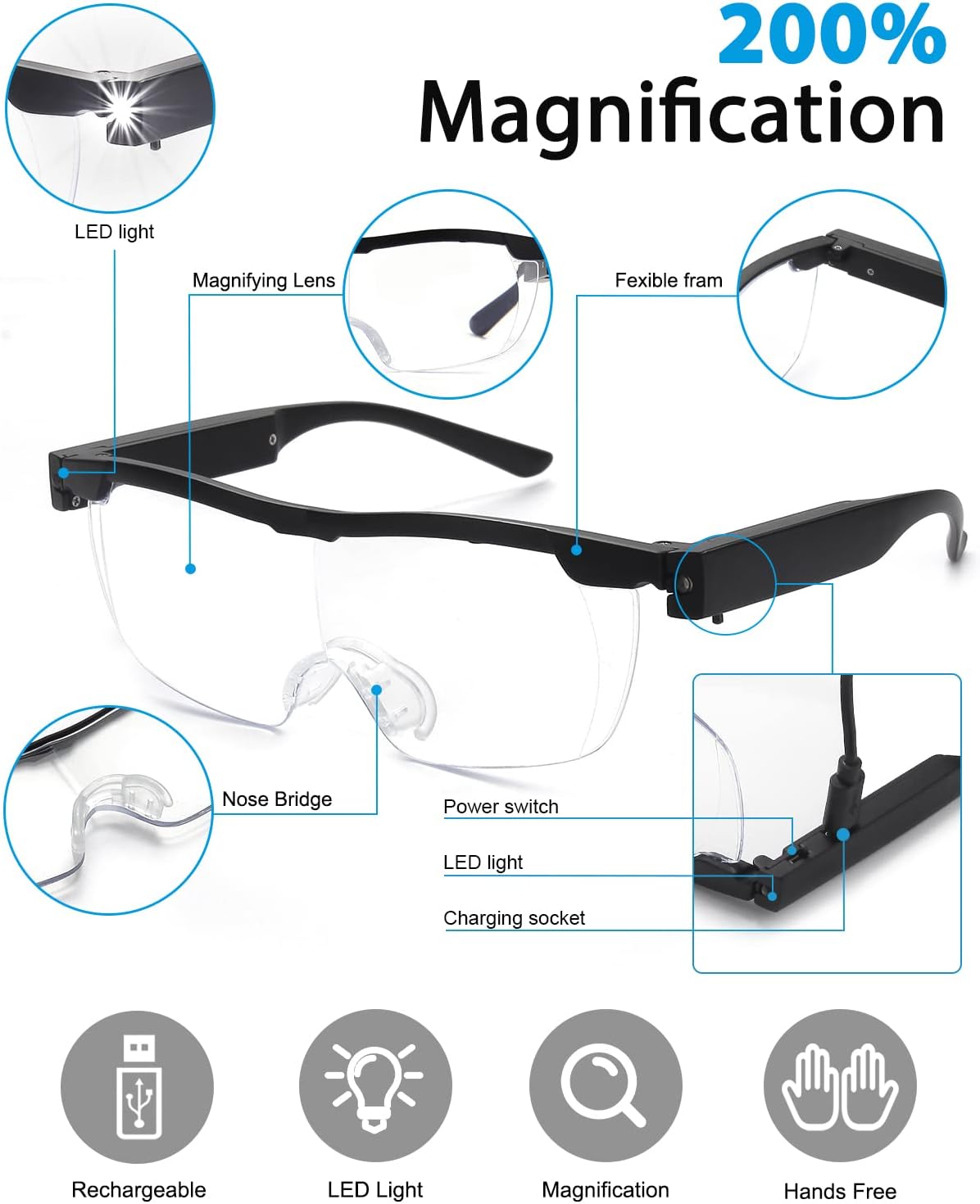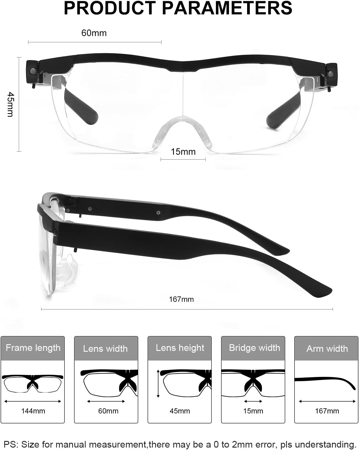 Review: OK.  Overall I like these glasses.  Would I buy it again, probably not.  They are lightweight and the vision is great.  But there are two things that you need to be aware of with these glasses.  Number one, while the lights on the side are nice, the charge doesn’t last long.  You have to charge each one individually, and the connection point is cheap.  I’ve already pushed one in and the connector pushed into the black plastic and is basically not useable anymore. The second point is the eyeglass fit.  They give you a rubber nose piece to put on the glasses because you need to wear these close to the tip of your nose.  Ok so far.  But then this means that the hard plastic unbendable piece at your ear sits on top of your ear instead of wrapping around it.  REALLY annoying and poor design.  I’ve tried heating them up to see if I could bend them backwards, but no luck.  Too bad.  These earpieces should have come “extendable”.  Then I would rate these a five star.  I don’t really use the lights anyway.  FYI, by the way, I have a normal size head.  My. wife had the same issue when she tried them on.  So, I cannot recommend these.