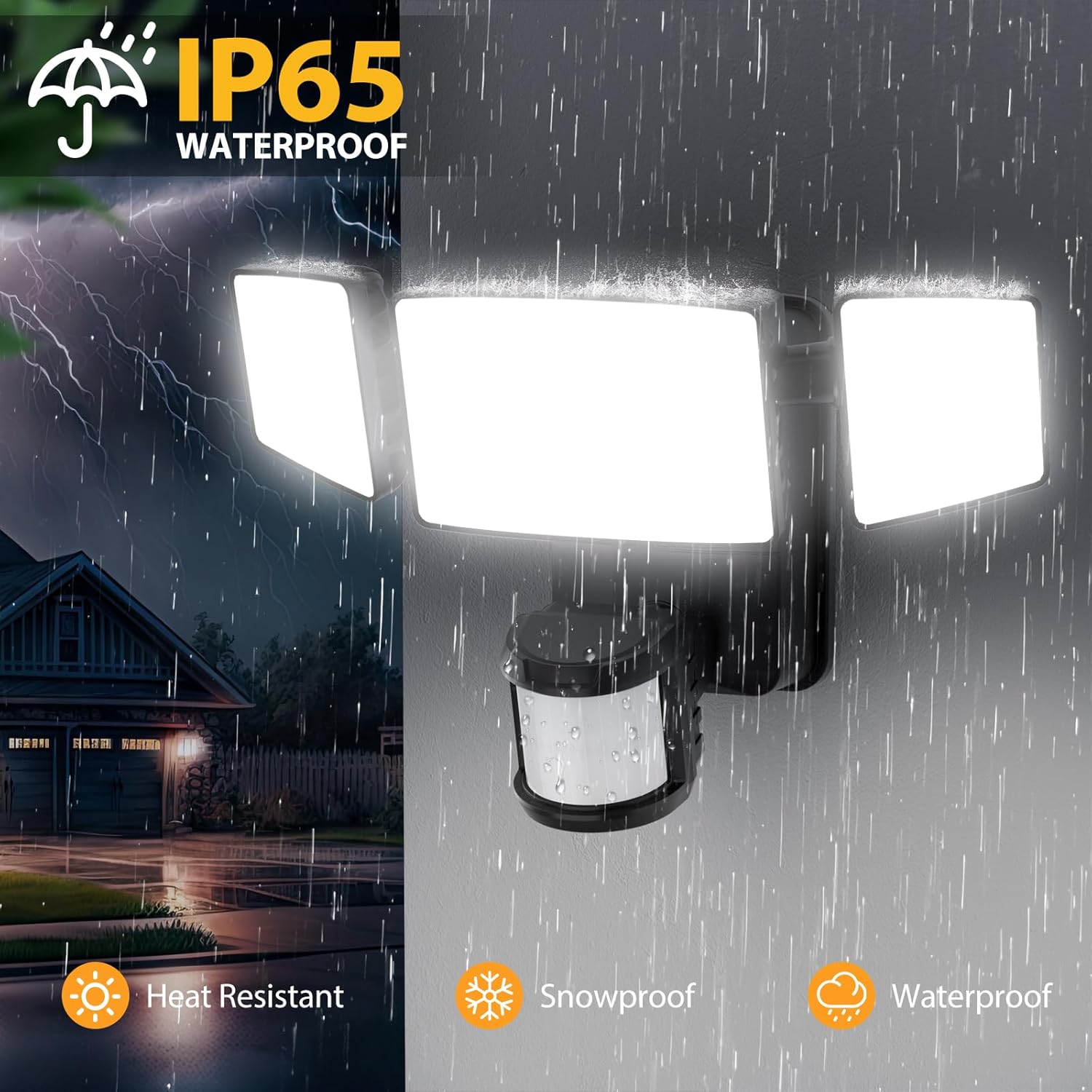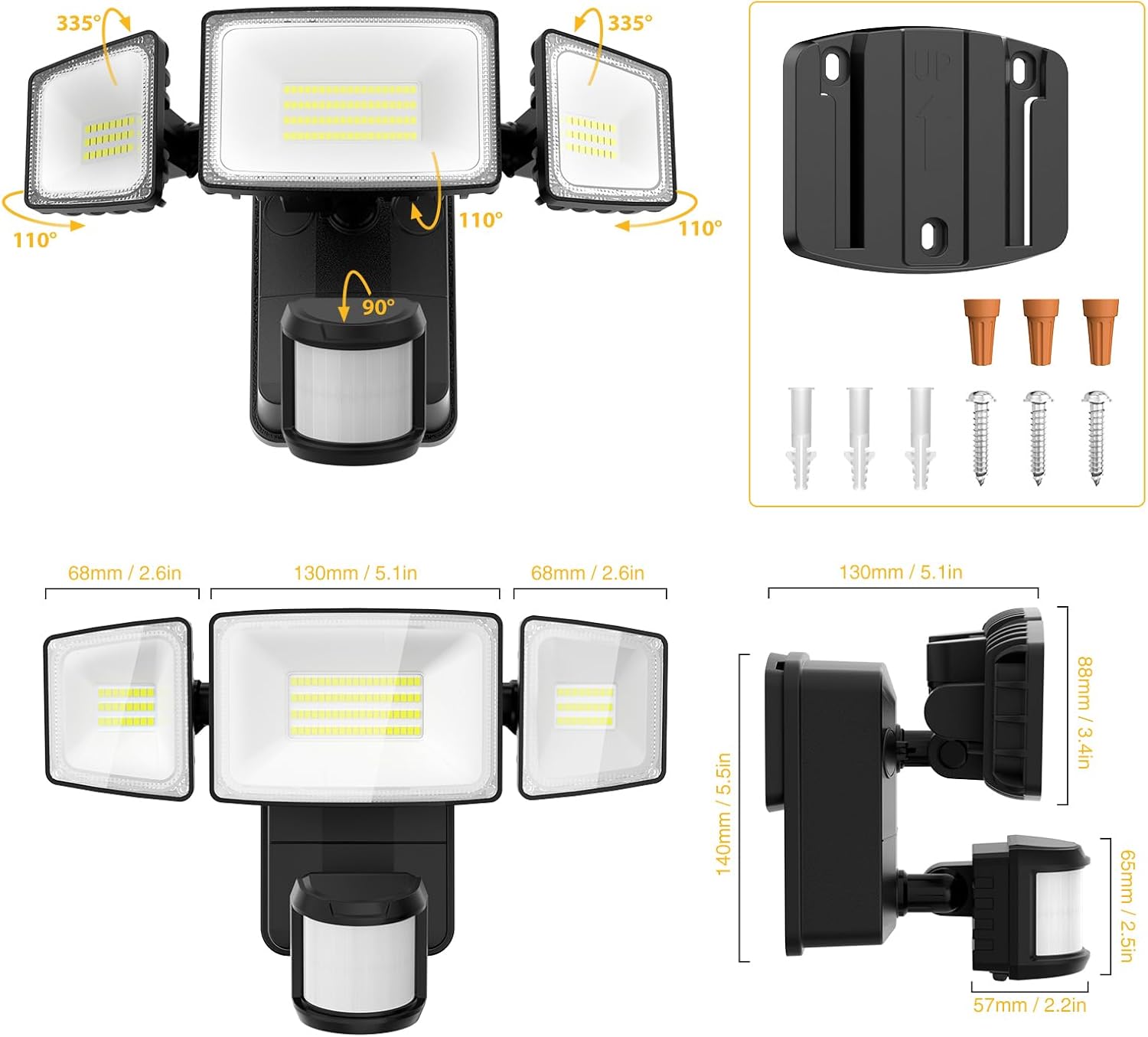 Review: Received the light array quickly and in one piece. I had an electrician install several of these lights because I don’t do high ladders any more. But, I watched from my deck and saw it was fairly easy to set up. These lights are very bright and will get brighter if they detect motion. So far so good!