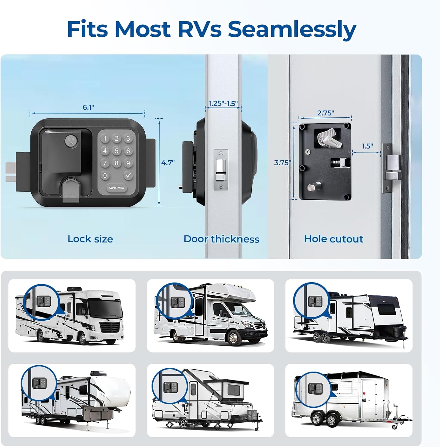 Perfectly Sized for RVs: The camper door lock fits standard camper openings (3.75" x 2.75" x 1.5") and has an exterior size of 6.1" x 4.7", making it ideal for most RV doors with right-side hinges. Comes with installation tools and a user manual. Note: Batteries are not supplied