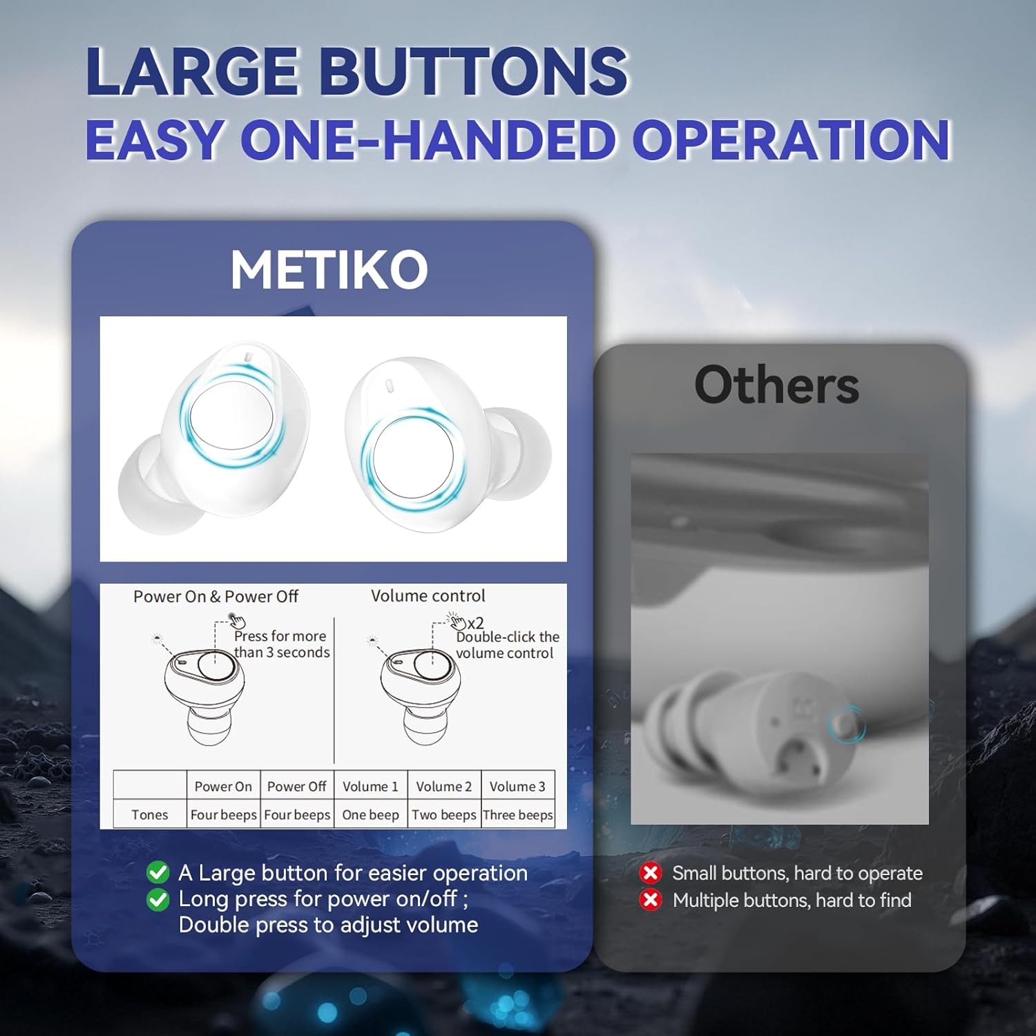 Review: I am super happy with these METIKO OTC Hearing aids. I am a senior and slightly hard of hearing in my left ear. Definitely cannot afford the hearing aids the doctor prescribed. At my part time job some people speak very softly and I can barely hear them and at home some of the channels on tv have a softer volume than others. So these hearing aids are really helping me. They charge up nicely and make it easier to hear with and increased ability to hear without any tinny sound that some hearing aids give. Reasonable priced and comfortable.