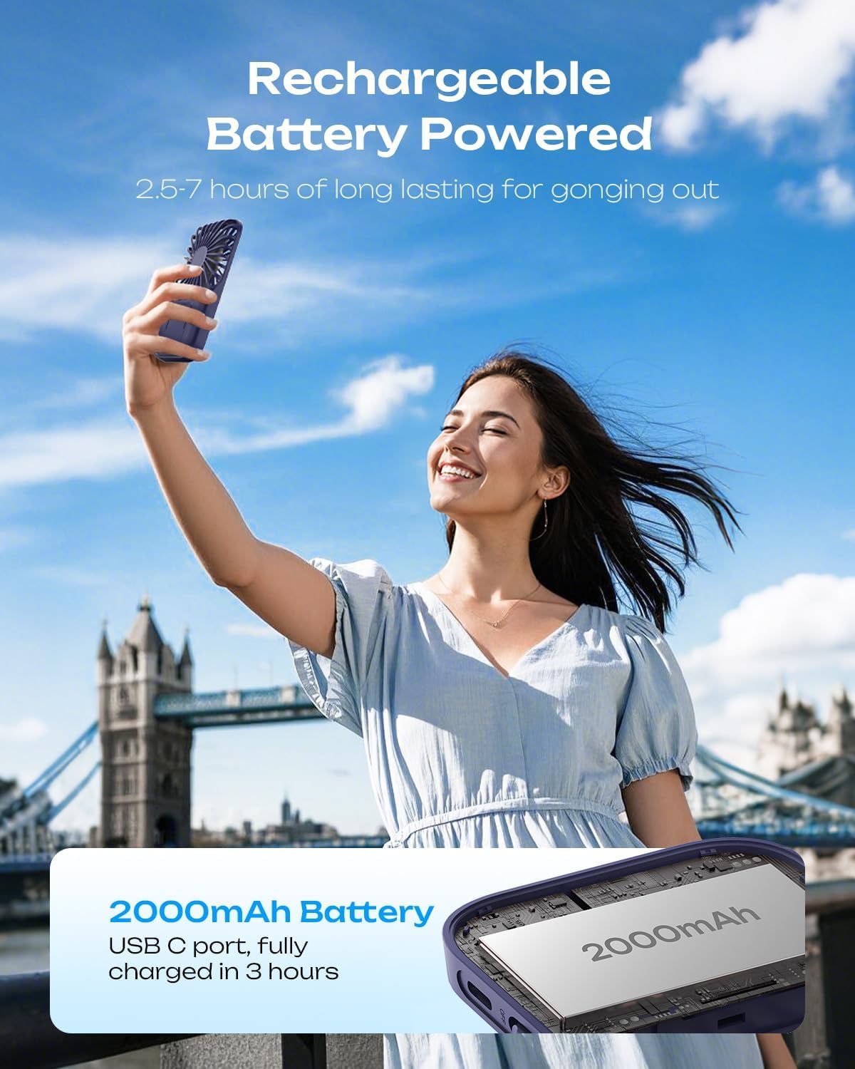 3 Speeds & USB-C Charge: Choose from 3 wind modes for indoor or outdoor using. Powered by a 2000mAh battery (2.5-7 hrs runtime), this rechargeable mini fan portable helps keep you feel cool and comfortable