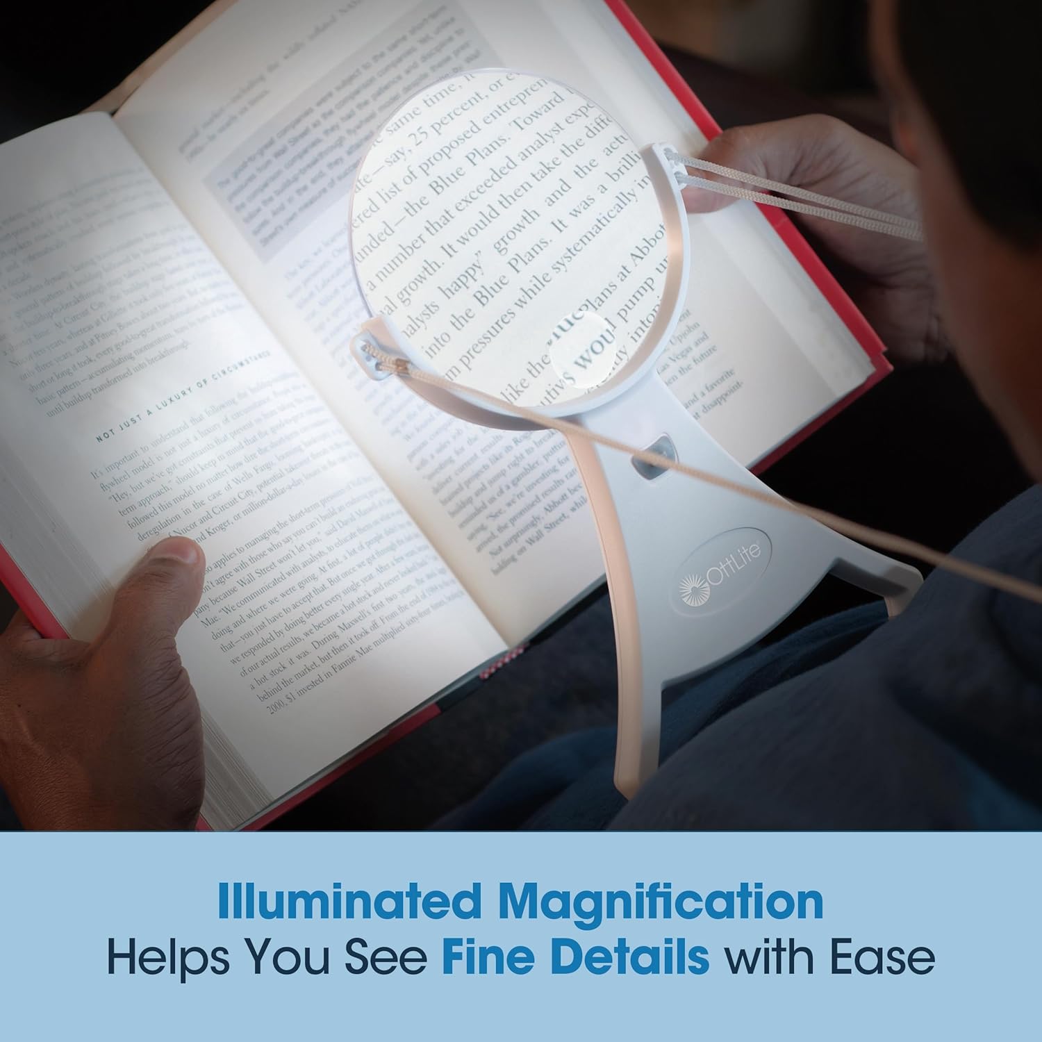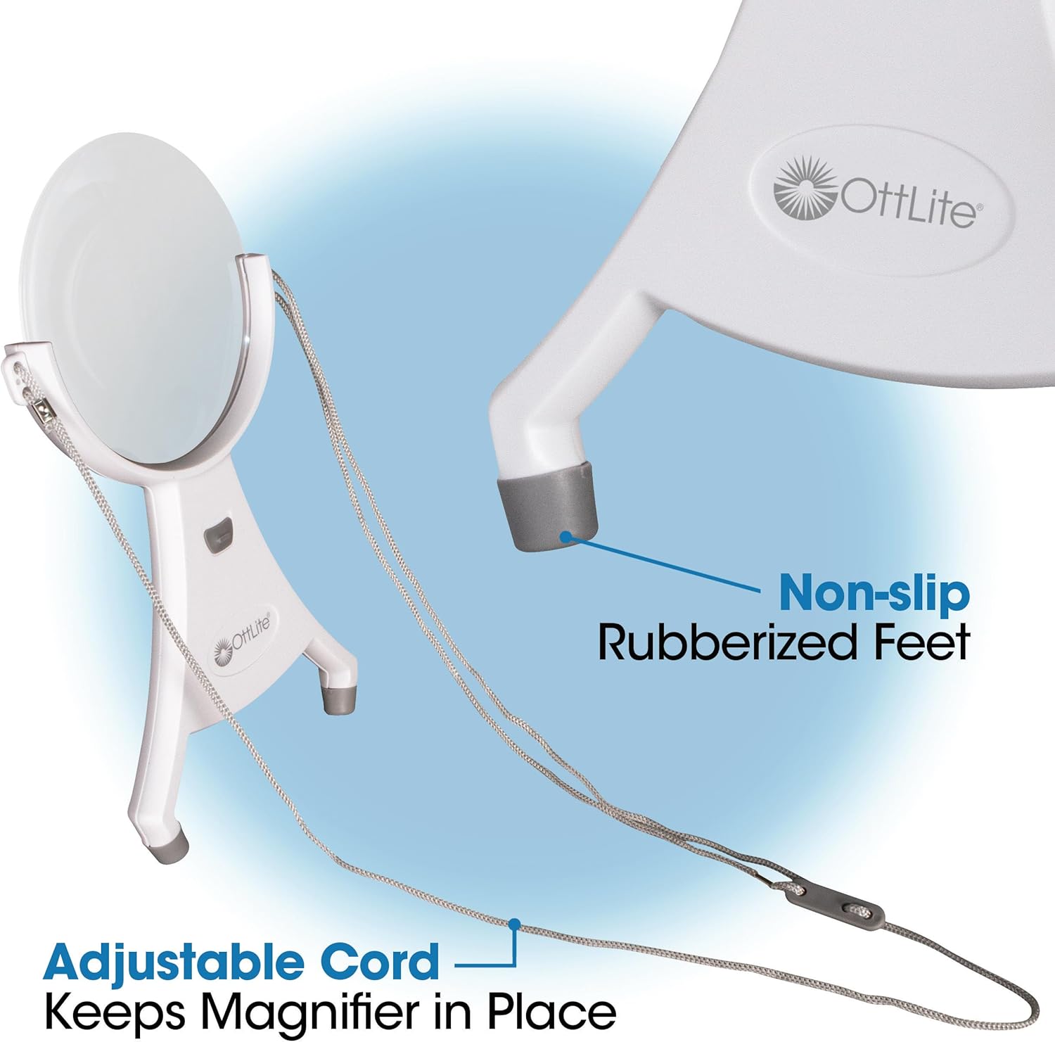 Review: This light /magnifier combination is exactly what I needed for doing needlepoint in the evenings. I hadn’t been sure if it would stay in place propped against my chest, but the feet on it stabilize it perfectly. The light is bright enough for work but not distracting to my family while watching TV. Unlike others who have commented, the insert high-magnification is not in the way for me during use. I hope the batteries will last a while, but AAA batteries are easy to get. I’m very glad I bought this! Thank you to Ottlite.