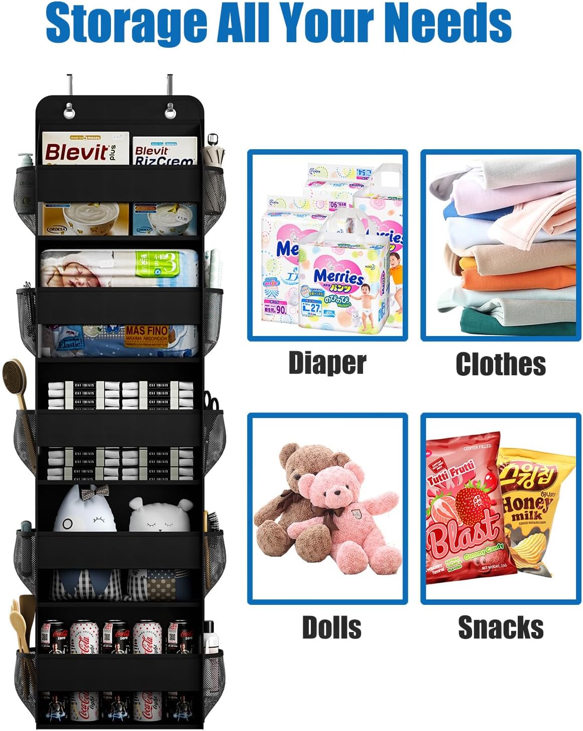 - Swing-proof with extra hook & loop strips. Suitable for storing cosmetics, clothes, socks, dolls, scarves, towels, toys, stationery, snacks, bottles, baby products