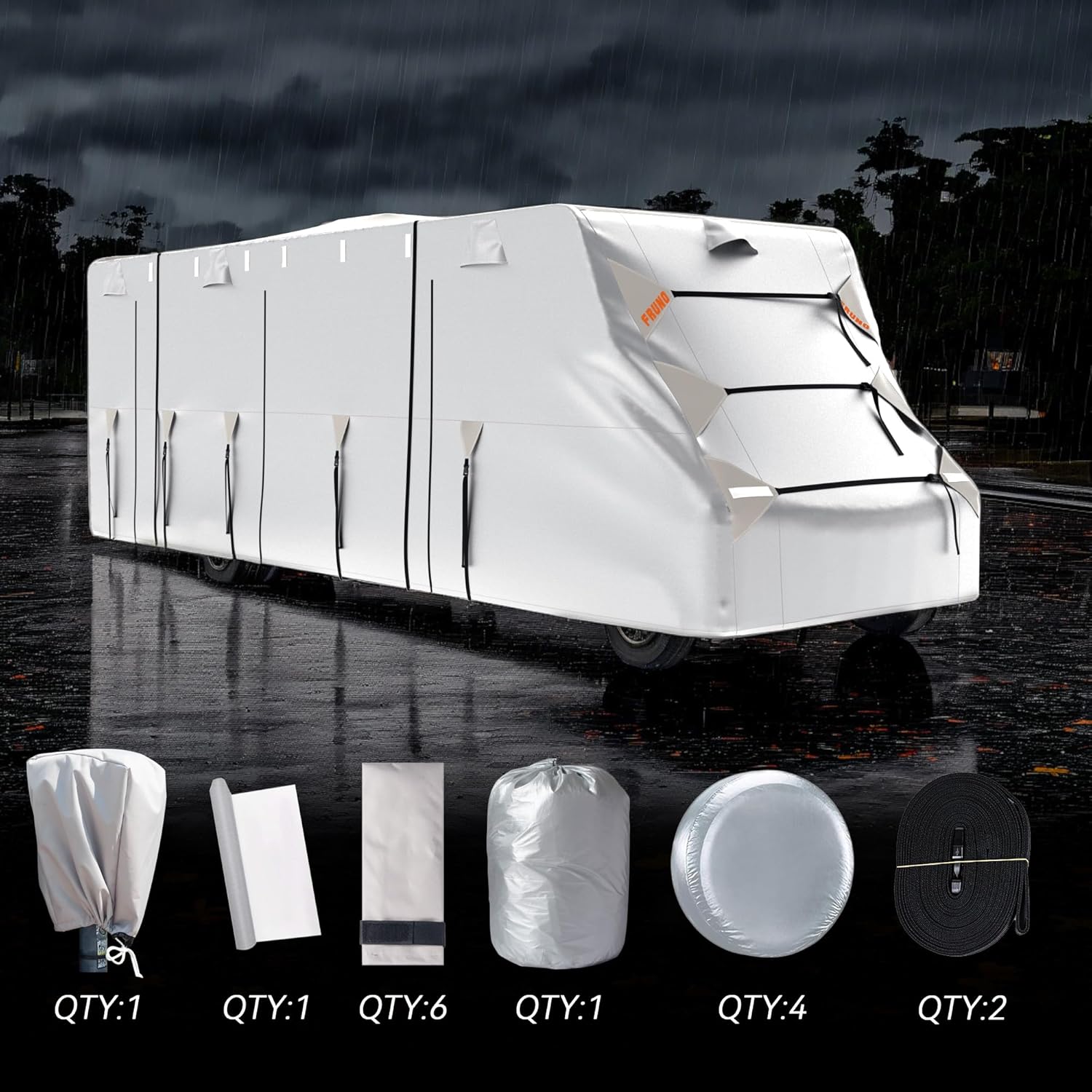 FULL CONTENT: RV Cover ×1, Tire Cover ×4, Lashing Strap ×2, Gutter Spout Cover ×6, Jack Cover ×1, Adhesive Repair Patch ×1, Storage Bag ×1. Please measure before purchase. Measurement should include the bumper, ladder and spare tire, but not include the hitch. Please cover or tape any sharp edges with towels, rags or foam pads to prevent wear and tear on your cover.