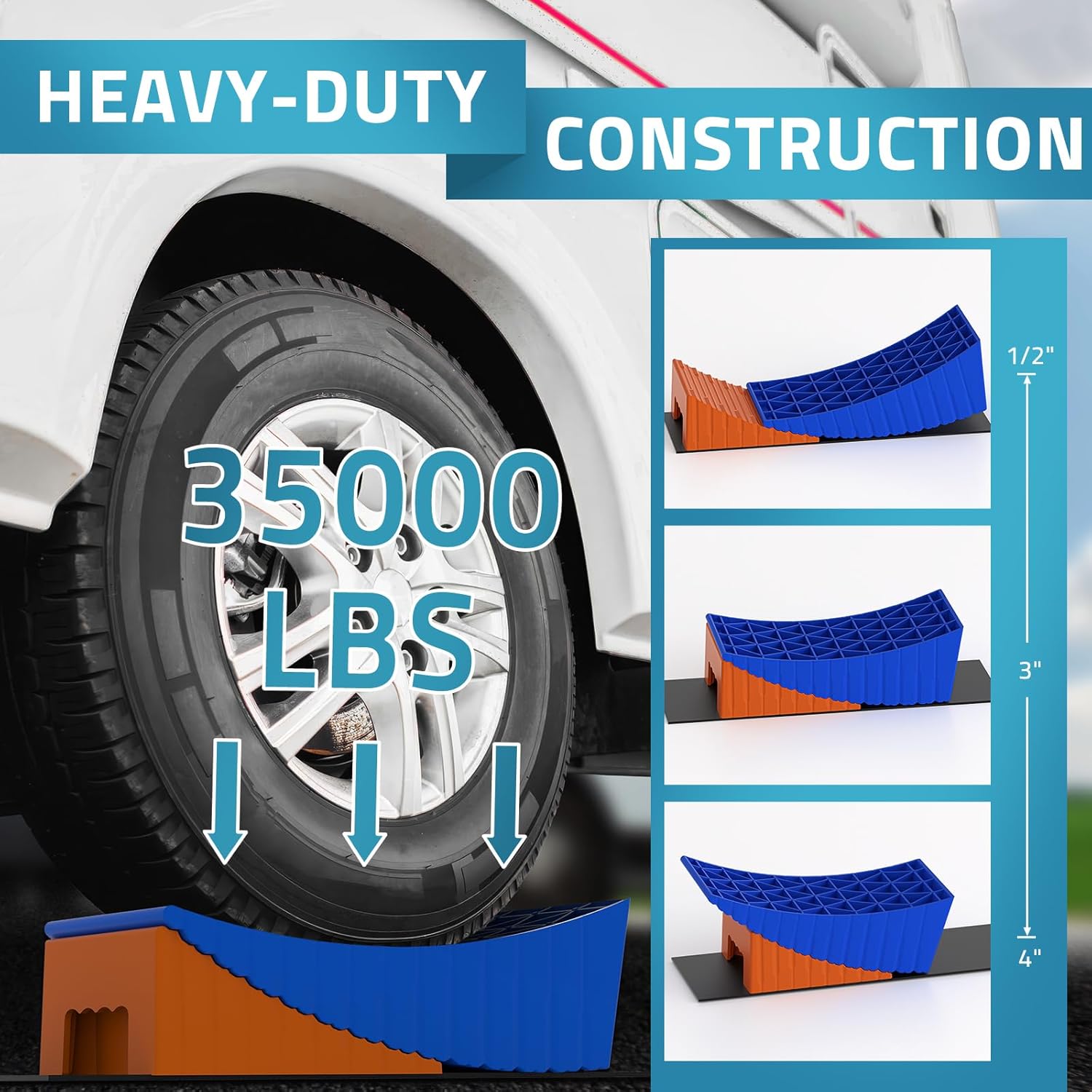 【Faster & Easier to level】No more than 5 minutes to level your trailer with any increment between 1/2"& 4". First, put the Non-Slip Mat before placing the curved leveler. Second, drive your camper onto the leveler to the height you want to. Third, add the chock under the leveler.