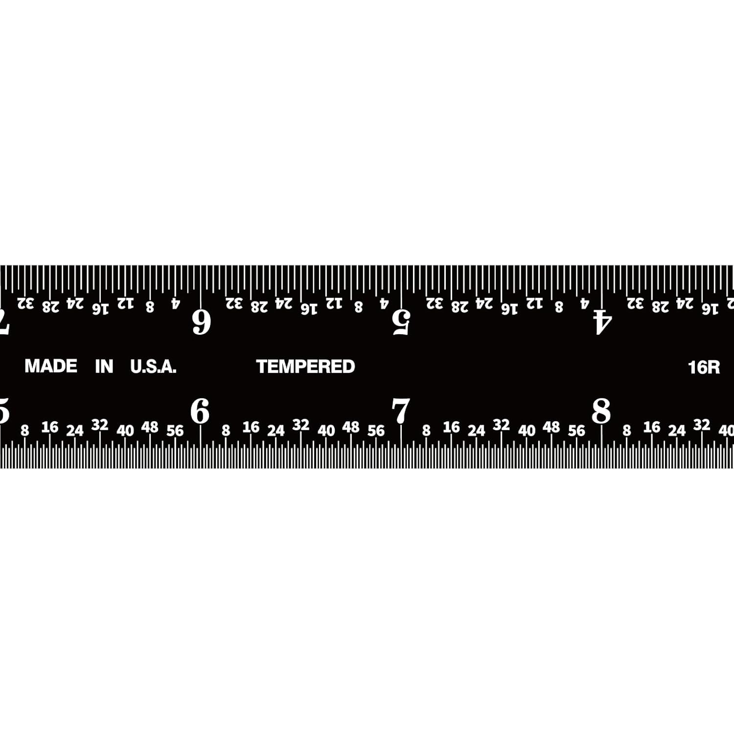 Length: 12″ | Graduations: 16R; 32nds, 64ths, 50ths, 100ths | Thickness: 0.035″ | Width: 1″ | Rigid Stainless Steel Construction | Black Chrome Finish