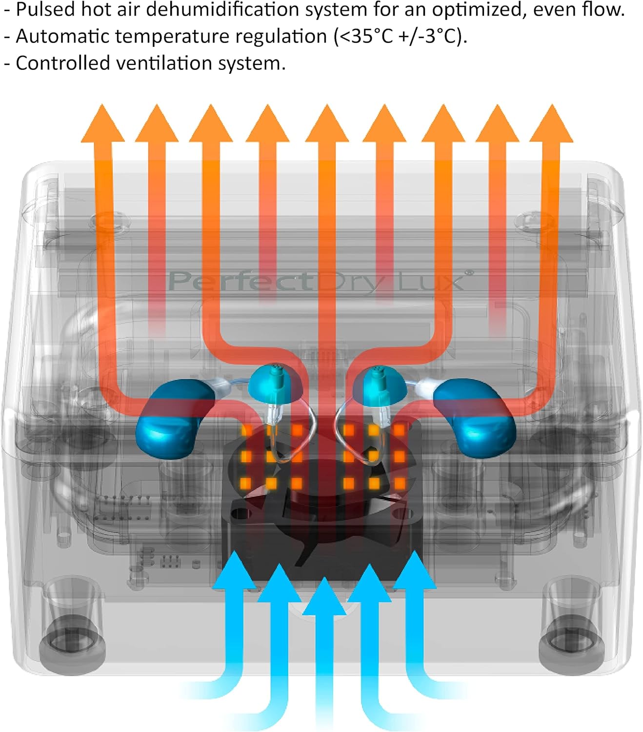 Review: It operates as described and only take about 45 minutes to dry my hearing aids.  I bought the item afterI bought the item after stepping into the shower, forgetting to remove my hearing aids.  They didn’t get soaked, but I didn’t know how much water they had absorbed.  I searched for a remedy on line, saw the ad  on Amazon, ordered the item, it arrived within 1-2 days and I immediately put my hearing aids in and it only  took 45 minutes to dry.  I was relieved and my hearing aids are working, I’m glad I have PerfectDry Lux on hand because I know I’m bound to have a relapse.