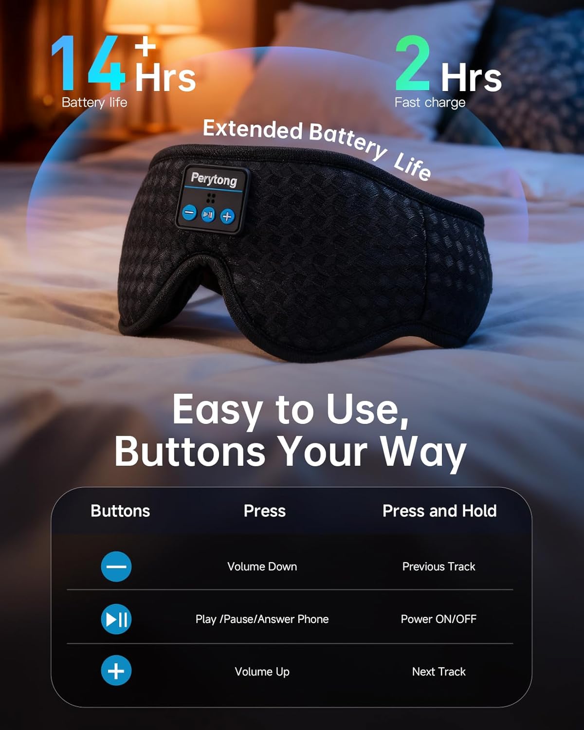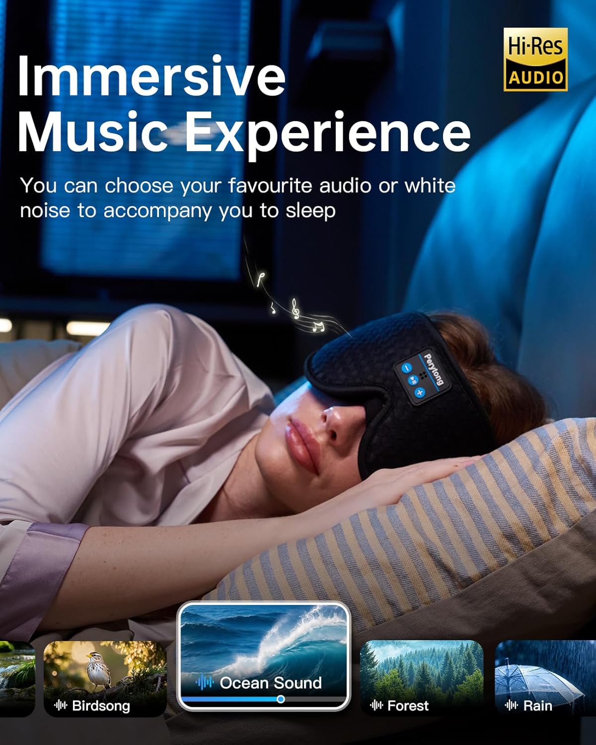 Review: This sleep mask is a game changer for deeper sleep. The 3D contoured design is super comfortable and puts zero pressure on my eyes, even when side sleeping. The ultra-thin speakers are surprisingly clear and immersive, and the Bluetooth 5.4 connects quickly with no dropouts. It blocks out light really well and helps mask background noise, making it perfect for sleep, meditation, or travel. Battery life easily lasts all night, and the adjustable strap gives a secure but gentle fit. For the price, the quality and comfort are impressive—I’d absolutely recommend it.