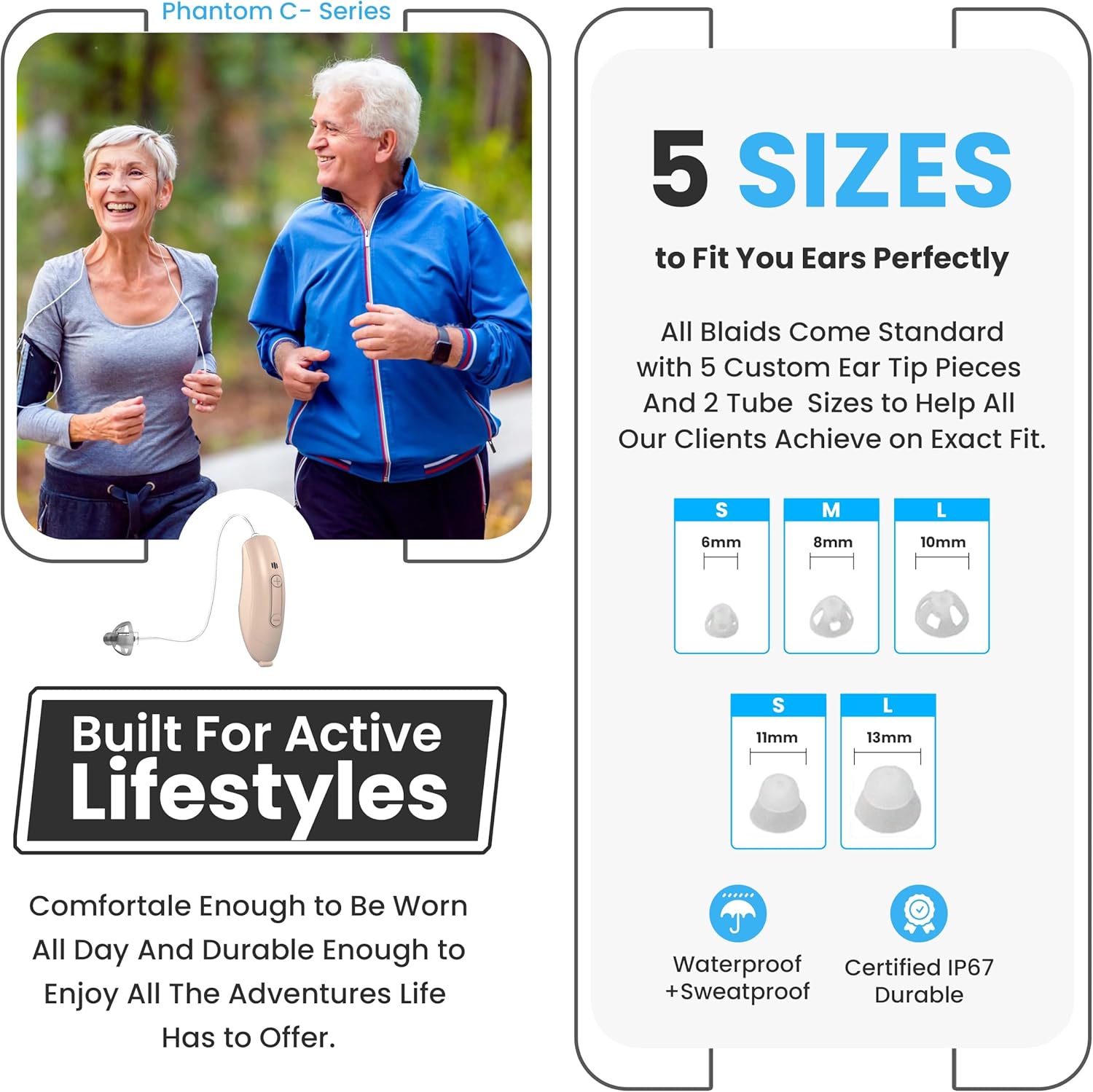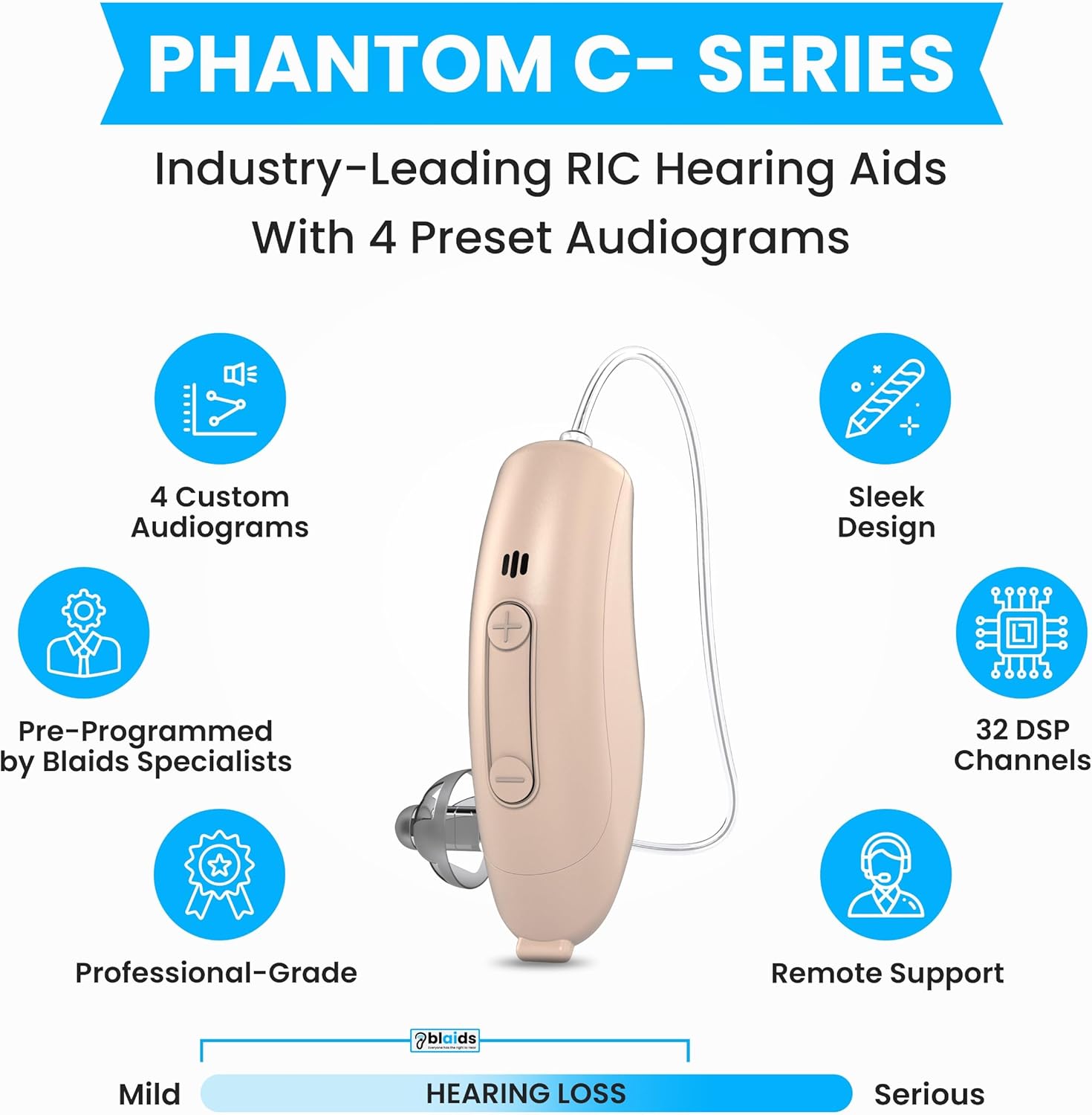 Review: he Phantom RIC Hearing Aids have been a life-changer for my parent. They deliver outstanding sound quality with their advanced USA-made processor, noise cancellation, and 32 DSP channels, making conversations clear and effortless. The customizable audiograms are a great touch, allowing easy adjustments for different environments.Their discreet, comfortable design fits perfectly and gives my parent confidence without the bulk of typical hearing aids. Easy to use and with impressive battery life, these aids have brought back the joy of hearing. Highly recommend them to anyone seeking reliable, professional-grade hearing support!