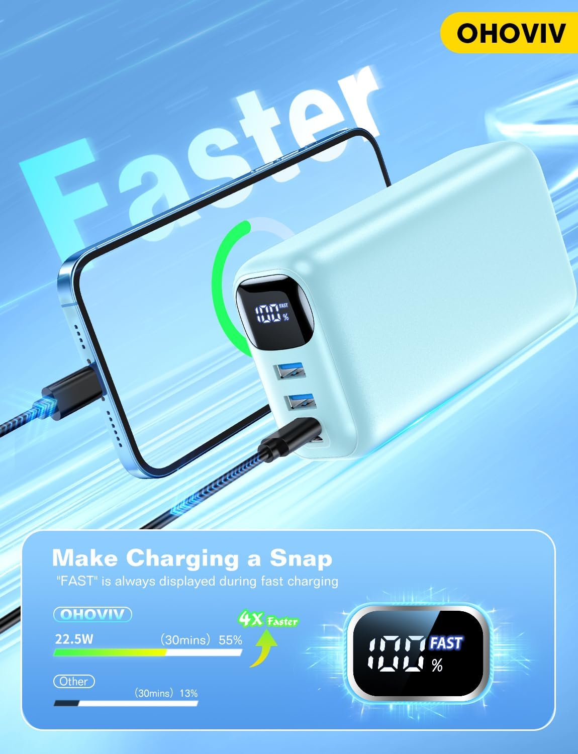 【Latest PD 22.5W High-Speed Charging】OHOVIV 50000mAh Portable phone charger adopts the latest Super Charger Protocol and Fast Charger Protocol with 22.5W output USB-C port.Support QC4.0 QC3.0 high-capacity power bank with fast charging, it only takes 30 minutes to charge your iPhone 14 from 0% to 55%.