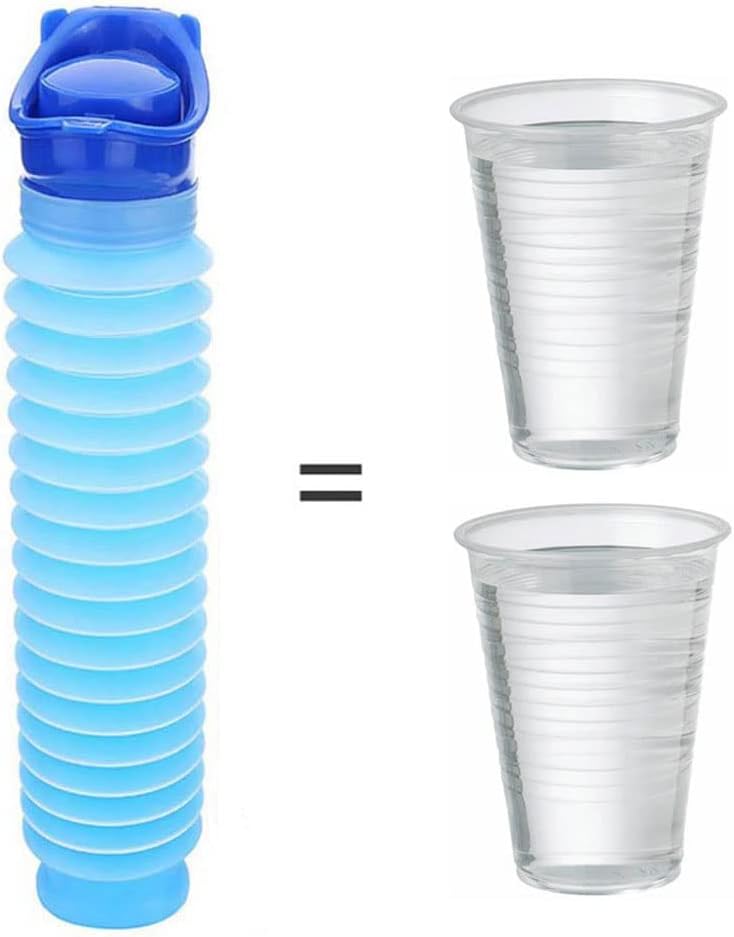 Review: I use these in my work van all the time. I can sit in the front seat in a parking lot and wave and smile to people with one hand while I wee wee and no one knows the difference. It’s flexible and bends. You can take a full man size wiz probably 3 or 4 times in these. Good seal and no leakage. They hold a lot but I don’t know why anyone wouldn’t just dump it after each use. Easy to clean. Be careful when you pop the top off and hold it away from your face or your gonna get a nice splash of golden sunshine in your mouth. I just dump it and pour some clorox in it for cleaning before next use, spray with lysol and let it dry in the garage overnight. Great product. I bought 2.