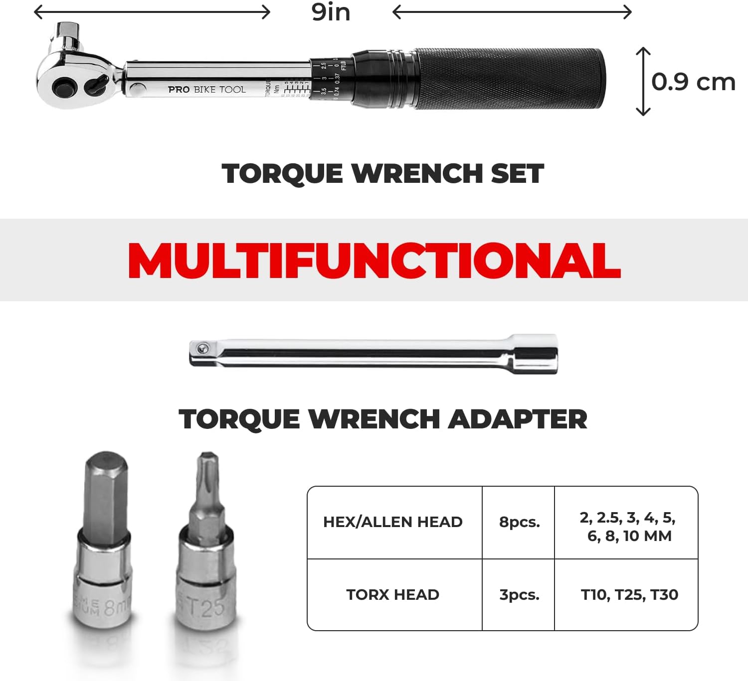 Review: Review: 4.5 StarsFirst off, the Pro Bike Tool 1/4 Inch Drive Click Bicycle Torque Wrench Set is an excellent tool for anyone looking to do their own bike maintenance. The torque wrench feels solid and well-built, and the included accessories (Allen and Torx bits) cover a wide variety of bike-related needs. The torque range of 2-20 Nm is perfect for ensuring all parts are properly tightened without over-torquing, which is crucial for bike safety.When it comes to precision, this torque wrench delivers. It’s ideal for tightening delicate parts like carbon fiber frames and high-tension bolts that require a specific torque. The click feature is quite satisfying—once you’ve tightened the bolt to the correct setting, the wrench emits a clear “click” to indicate that the job is done. This is essential for anyone who wants to avoid the risk of damaging parts by over-tightening.The tool’s build quality stands out, as it feels solid and durable. The handle offers a comfortable grip, and despite being lightweight, it doesn’t feel flimsy or cheap. While it doesn’t come with a carrying case for organized storage, the compact design makes it easy to store in your toolbox. The set also includes a wide range of bits, so you won’t have to buy additional tools for most maintenance jobs on your bike.I’ve rated it 4.5 stars because, while the tool is high quality, the torque wrench adapter feels slightly loose when attached to the wrench. This doesn’t affect its functionality much, but it can make some tasks feel a little less secure. That being said, the overall quality and performance are fantastic—it’s definitely a great value for the price, especially considering how precise and durable the tool feels. A must-have for bike repairs!Pros:Accurate Torque Settings: Ensures precise torque for safe and effective bike maintenance.Versatile Set: Includes various bits (Allen and Torx), making it great for a wide range of repairs.Sturdy Construction: The tool feels solid and durable, giving confidence in its longevity.Easy to Use: The click sound when the proper torque is reached is clear and reliable.Compact: Small and lightweight, making it easy to carry and store.Affordable: Great value for a quality tool that covers a lot of bike maintenance needs.Cons:Loose Adapter: The torque wrench adapter feels slightly loose when attached, which may affect stability.Limited Bit Options: Not a lot of options for Torx and Allen bits, but most should fit bikes you’re working on.Conclusion:Overall, the Pro Bike Tool 1/4 Inch Drive Click Bicycle Torque Wrench Set is an excellent choice for bike enthusiasts and those looking to do their own maintenance. Despite the minor drawback of the loose adapter, the precision, build quality, and versatility of the tool make it a great investment. For the price, you’re getting a reliable tool that will keep your bike components safely and correctly tightened. If you’re in the market for a torque wrench set for bike repairs, this one is definitely worth considering.