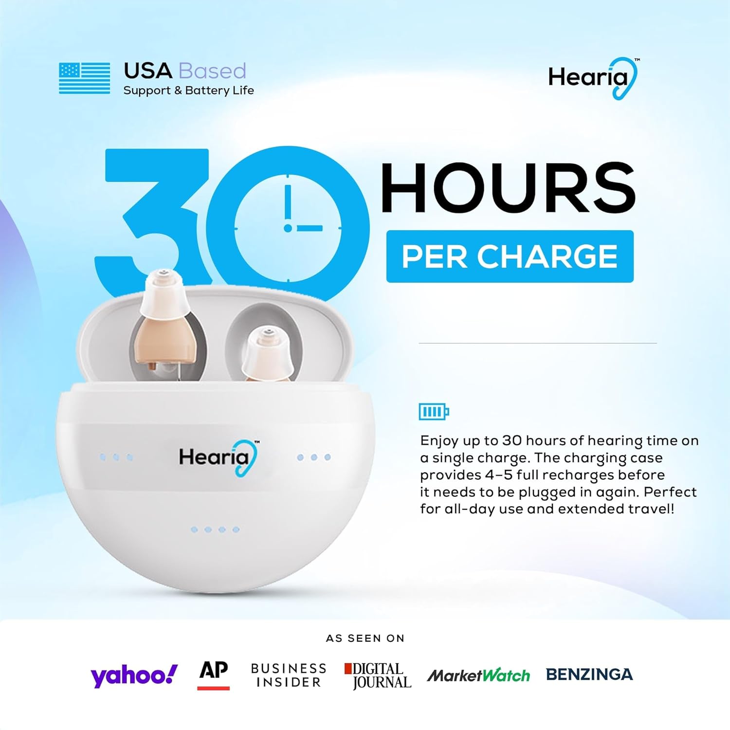 Review: These hearing aids do a good job in many respects but the style is just not for me. Here are my observations / experiences:FDA classifications / listing: These may well be FDA classified hearing aids but I could not find them listed on the FDA site after considerable time searching. One reason could be that the actual manufacturer in China is not listed. This is not an issue other than I like to see hearing aids officially listed on the FDA site.SIZE: These hearing aids are tiny but they feel “heavy” on my ears. They are “invisible from head on and somewhat prominent from the side view. Despite their small size, using the control button was very easy and at no point did I experience unwanted feedback (screeching / squealing, etc.).SIMPLE CONTROLS: Each hearing aid has one control button that is easy to press. Quick presses are for increasing the volume (9 levels), and 3 second presses switch between 3 hearing modes (Quiet, Noisy, and Outdoor). There were distinct differences depending on the hearing mode I used which is not always the case with other hearing aids that have hearing modes.SOUND QUALITY: Mostly very good but sporting events with background (crowd) sounds often made hearing announcers a little challenging to hear. With more experimenting using the hearing modes I believe this could improve. Plus, the literature indicates hearing for new users improves over the first 3 weeks.BATTERY (built in): The manual indicates a 1.5-to-2-hour charge provide 25 to 30 hours or working time. When fully charged, the charging / storage case can be used to charge the hearing aids 4 to 5 times for 100 to 150 total hours of use without having to plug in using an outlet. These are good numbers and on the higher side of rechargeable hearing battery specs.INCLUDED: In addition to the 2 hearing aids, the charging / storage case, 6 pairs of silicone ear tips in various sizes, a mini-screwdriver, cleaning brush, USB C charging cord AND wall adapter (not usually included with other hearing aids), wax guard tool, and instructions.OVERALL: I have tried and reviewed a significant number of hearing aids. While I wish I could find these listed on the FDA site for this style they did very well. At the time of this review, they were just under $250 US using the listing’s $50 off online coupon (the list price is just under $300). It is worth noting that Hearia provides USA-based support. Ultimately, I prefer the BTE (behind the ear) RIC (receiver in canal) style as I feel they are less likely for me to misplace, etc., and I just personally prefer them. However, these are certainly worth consideration for those that prefer this style. My rating takes in to account the quality, price range, and style and is not meant to be compared to all hearing aids. [4.5 stars]
