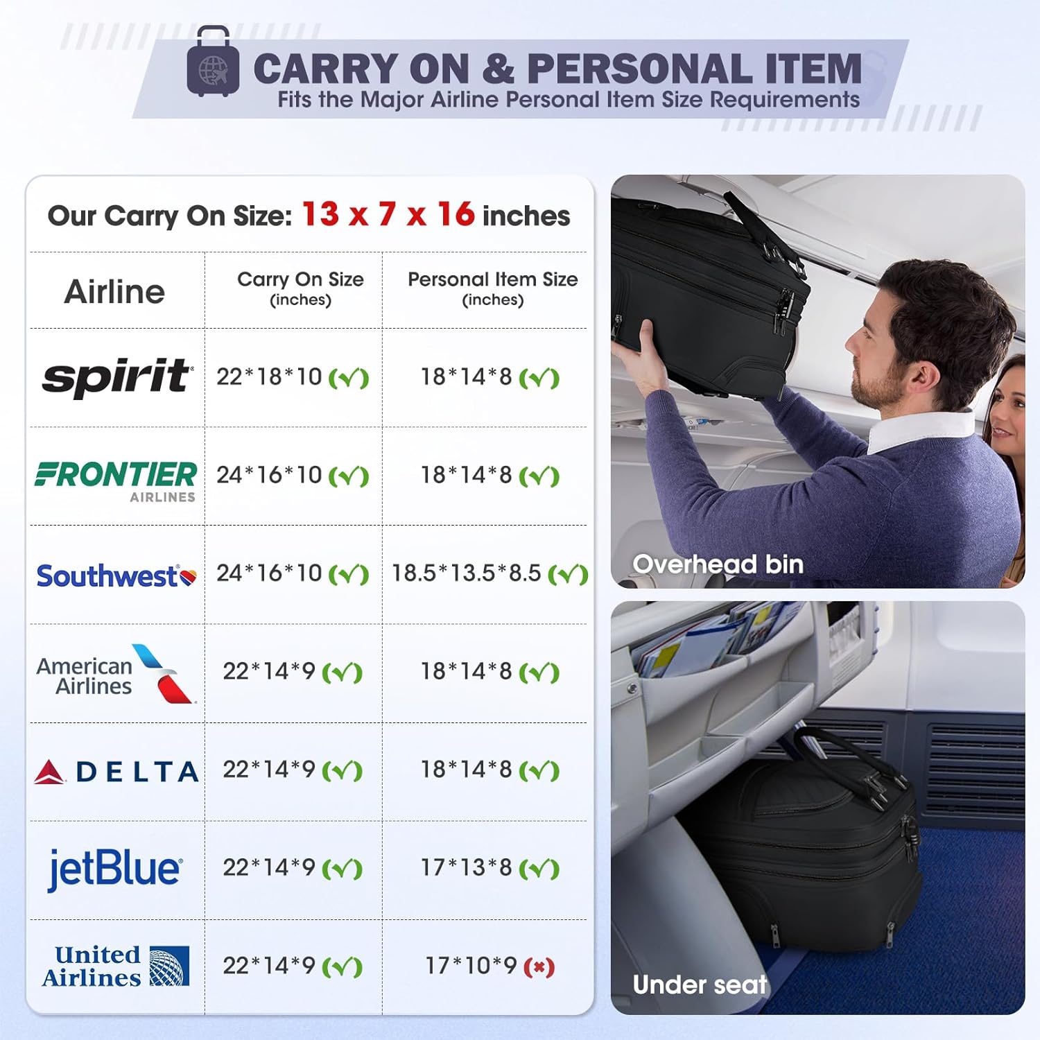 【AIRLINE APPROVED CARRY ON LUGGAGE】Overall dimensions: 13"L x 7"W x 16"H. Weight: 5.15lbs, this luggage meets most major airlines' sizes. 45°, 90° and 180° flat open helps you through security checkpoints without hassle. Compact 16-inch underseat carry-on luggage with wheels easily fits under seats and in the overhead carry-on sizer bin. Perfect suitcase choice for hassle-free travel.
