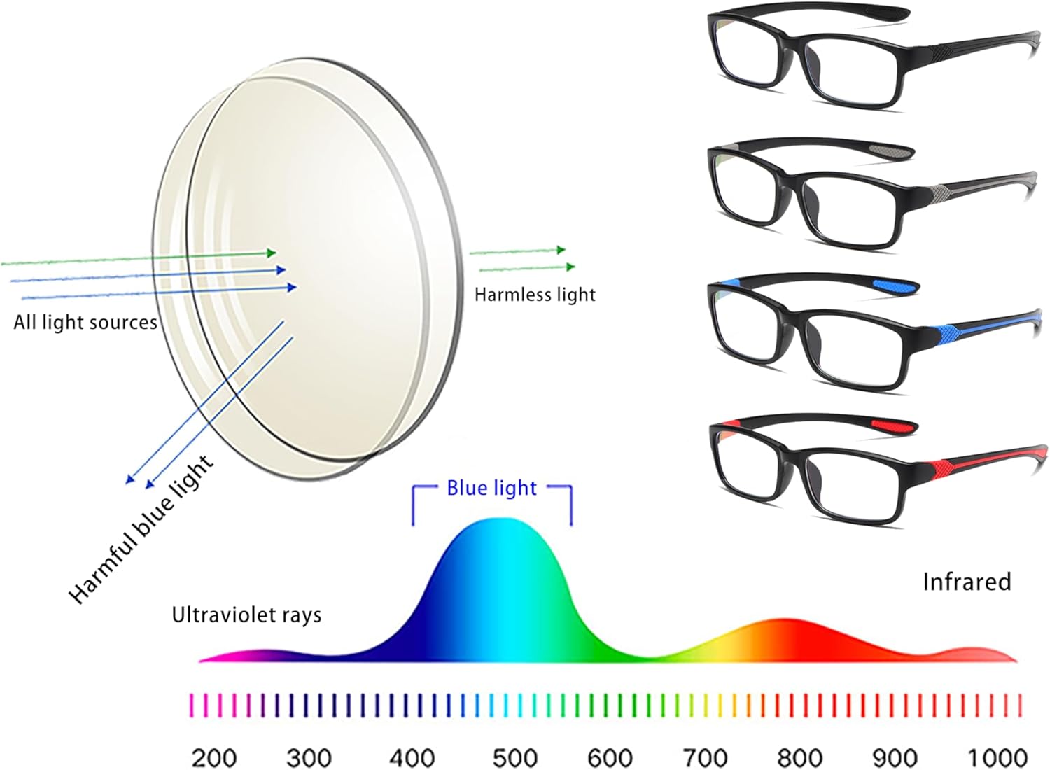 Review: These are very nice-looking glasses and are comfortable to wear. My issue with them is they break very easily and I’ve had multiple pairs break simply putting them on or taking them off. They also scratch very easily even though they are supposedly scratch proof. If they could fix these issues, I would buy them again but until they do, I would not recommend. Would also be nice if you could order them in all the same color rather than the having multiple color strips on the side.