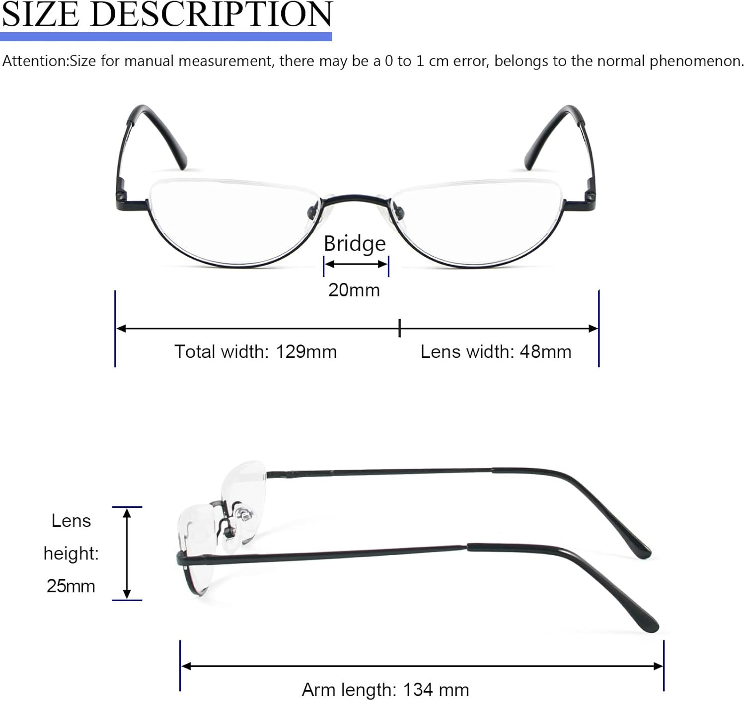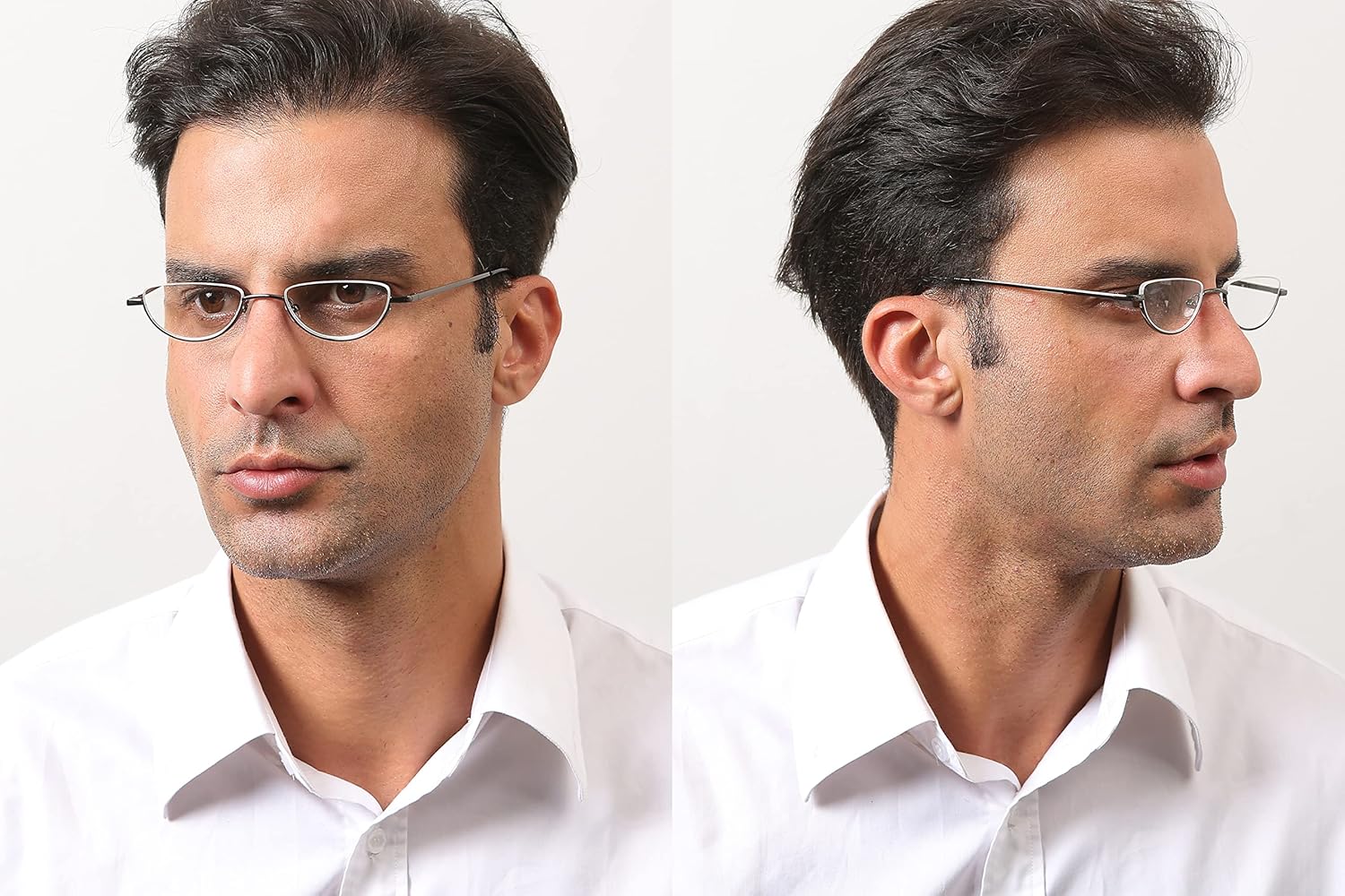 Review: ORIGINAL REVIEW (see update!): I like the half glasses, which I received today. WHY? Because you can look over them and see mid and far range. When you look down you can focus up close. Very versatile. I wouldn’t say they are sturdy because I had a pair and they are very lightweight, and the wire is flexible. Once they bent out of shape as my grandson came to hug me. They crushed onto my chest! In future I have to remind him to be careful not to crush the glasses! ALSO, I asked Amazon to make sure the lenses were perfectly positioned in the frame. A pair I bought a year ago had lenses that were crooked in the frame. The Amazon assistant immediately typed a note to the glasses packer to make sure the lenses were well-placed. They are perfect. Thanks Amazon!!UPDATE: ON CLOSER INSPECTION. LENSES ON 2 OF 3 GLASSES WERE NOT PLACED IN THE FRAME CORRECTLY. Lenses jut out from one side of the frame 500 mm at the bottom. Only glued on sides of lenses. Disappointed. Am returning 2 of the 3 glasses. THEY BETTER BE PERFECT! the gold frame one was okay. DISAPPOINTED! The company that sells REVEE half frame wire glasses NEEDS BETTER QUALITY CONTROL. OTHERWISE, THEY WASTE CUSTOMER TIME!4-19 Returned defective glasses by UPS and received replacement glasses 4-18. AGAIN, one out of 3 were defective. left lens jutted out one-half centimeter from the wire frame at the bottom. Downgraded my rating to a 3 (really should have been a 2). (see PHOTO) I would not want to subject busy friends of colleagues to the inconvenience of driving to UPS to return the items to AMAZON. I urge Amazon to contract with an over-the counter reading glass company that has reliable QUALITY CONTROL!!! I am a loyal and frequent customer of AMAZON. I have no time to return the defective silver glasses and will just keep it. But I must say, I am quite disappointed at the moment! 🙁