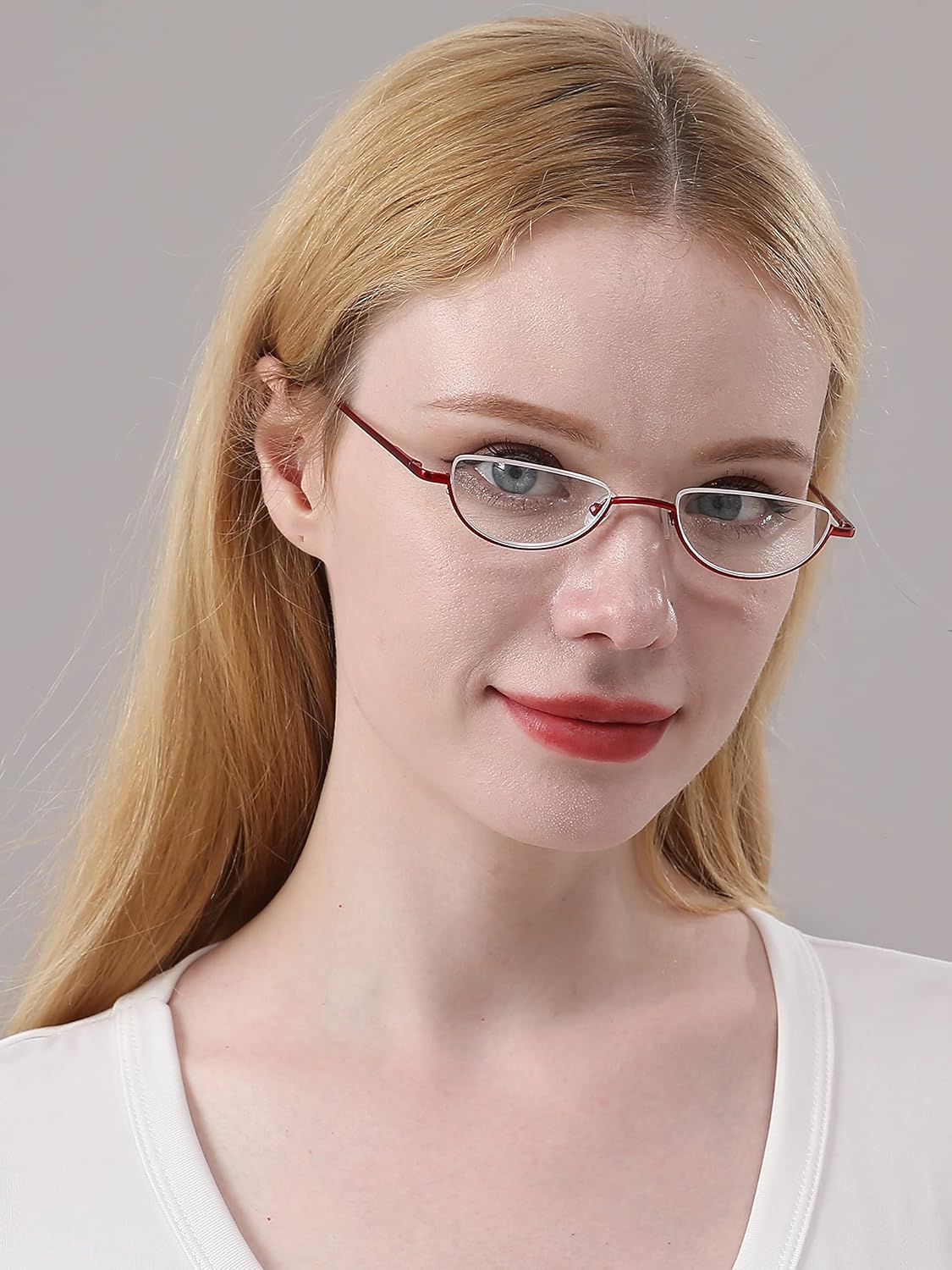 Review: These are my favorite of the half Rim style glasses sold on amazon. They’re a little more sturdy than the plastic ones. They are still lightweight . They have a bit taller lens. They fit my narrow face pretty good although I have to put rubber stoppers behind my ear to keep them from falling off if I bend over. I wish some of these companies would make glasses specifically for women’s smaller faces and head as I cannot get them narrow enough width across the front of my face.