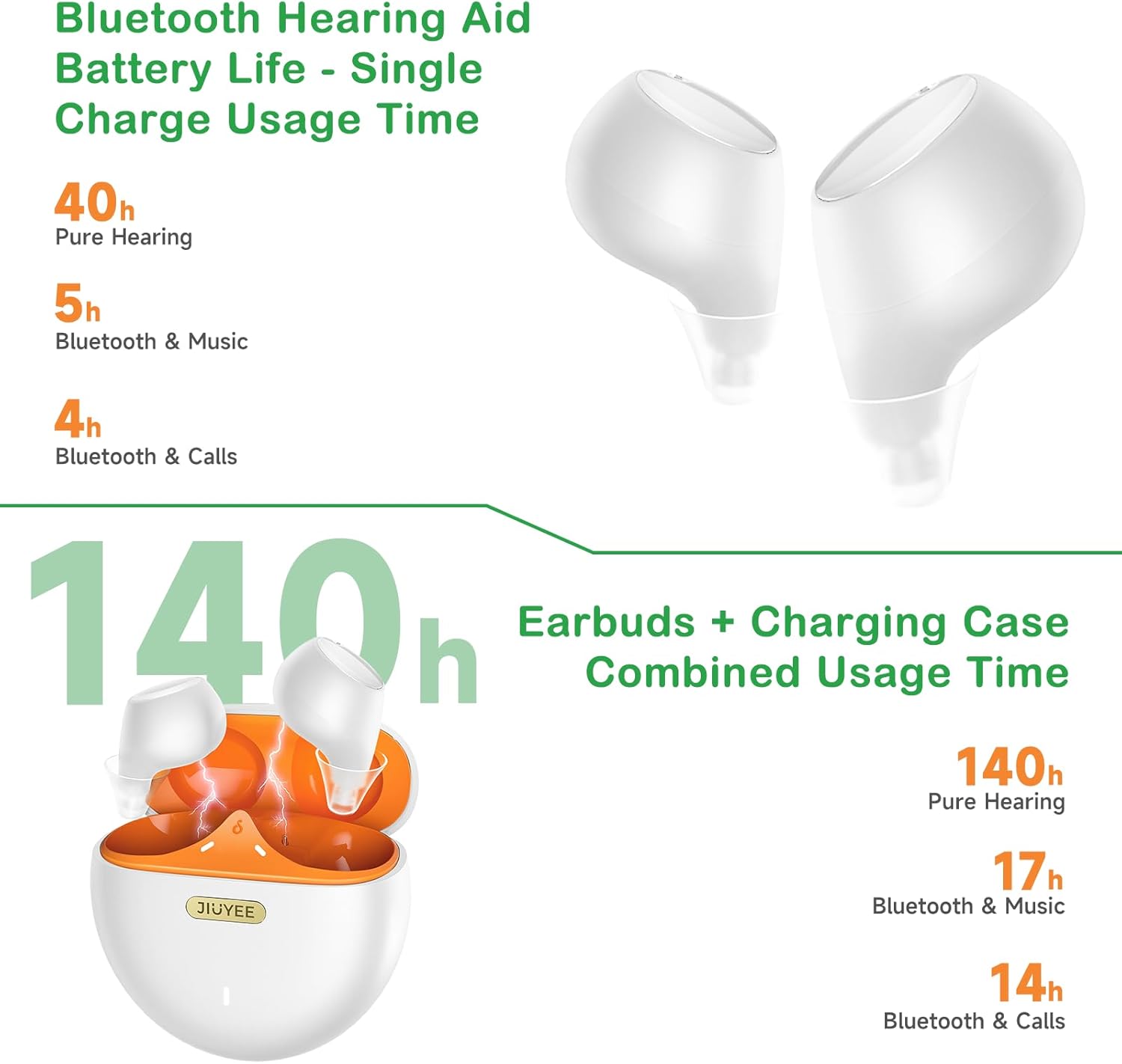 Review: I have been identified by an audiologist with mild to moderate hearing loss. Prescribed hearing aids were between $2000 and $9000 dollars. I can’t do that. OTC hearing aids were between $250 and $1500 – better but having tried some and their apps, I was less than happy. Found these on Amazon for $69 and I thought – that’s a dinner out – I can afford that. Wow am I shocked at how good they are.1. Amazon delivered them next day at 4:40 in the morning – how good is that.2. Packaging – more professionally packed with instructions better than my wifes top shelf $3000 hearing aids.3. Setup – easy setup following the app – though I did have to install it twice to get it to work properly – but I had to do that with most apps I tried for hearing anyway.4. Customizaiton – far better than any other app I found – the hearing test actually went through all the different frequencies rather than just 3 custom programs like most have – it was as effective as at the doctors office.5. Fit – at first there was much howling but between the app and fitting new earpieces completely fixed it. Very comfortable with the supplied sizes of earpieces.6. Battery – so far out of the box, I have been wearing them for 3 hours and they still show 70%. App shows it easily – and volume control on the app is very good.7. Bluetooth connectivity – easy to use, although at first if you touch them it disconnects the phone – you have to ensure that touch controls on the earpieces are shut off.8. Quality of sound – I’ve been listening to my albums and the sound is surprisingly good. For the price – outstanding.9. By the way, I am using iPhone, but they work for Android as well.Overall, I am completely satisfied with this product. It wipes the floor with virtually every other product I have tried or was looking at. Thanks so much to Amazon and to Jiuyee.EDIT AFTER CONTINUED USE – I returned them. Maybe it is just me, but after altering the settings to reduce the howling and background noise (which worked) I found that these hearing aids were producing virtually no sound – it was better and more comfortable without them. I sent them back. Maybe it is just me – but I found they did not work for me. I still think except for that one thing (improving my hearing) it was a really professional product.