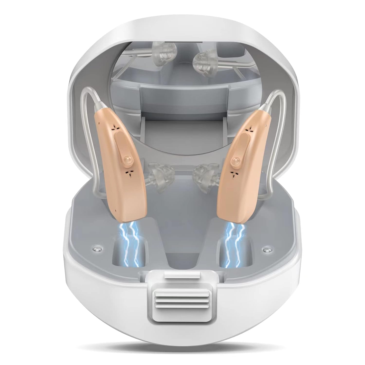 Review: I’ve been wearing $4000 hearing aids for several years… Shopping around for OTC – less costly. These hearing aids provide good hearing in many ways for MY moderate to severe hearing loss. Actually couldn’t believe how well they worked!! I am so impressed. I’m going to search for more costly product that has iPhone control because I’m over 80 and have trouble with my hands. Such a blessing for hearing loss… Don’t short change yourself… Will improve your life. Thank you