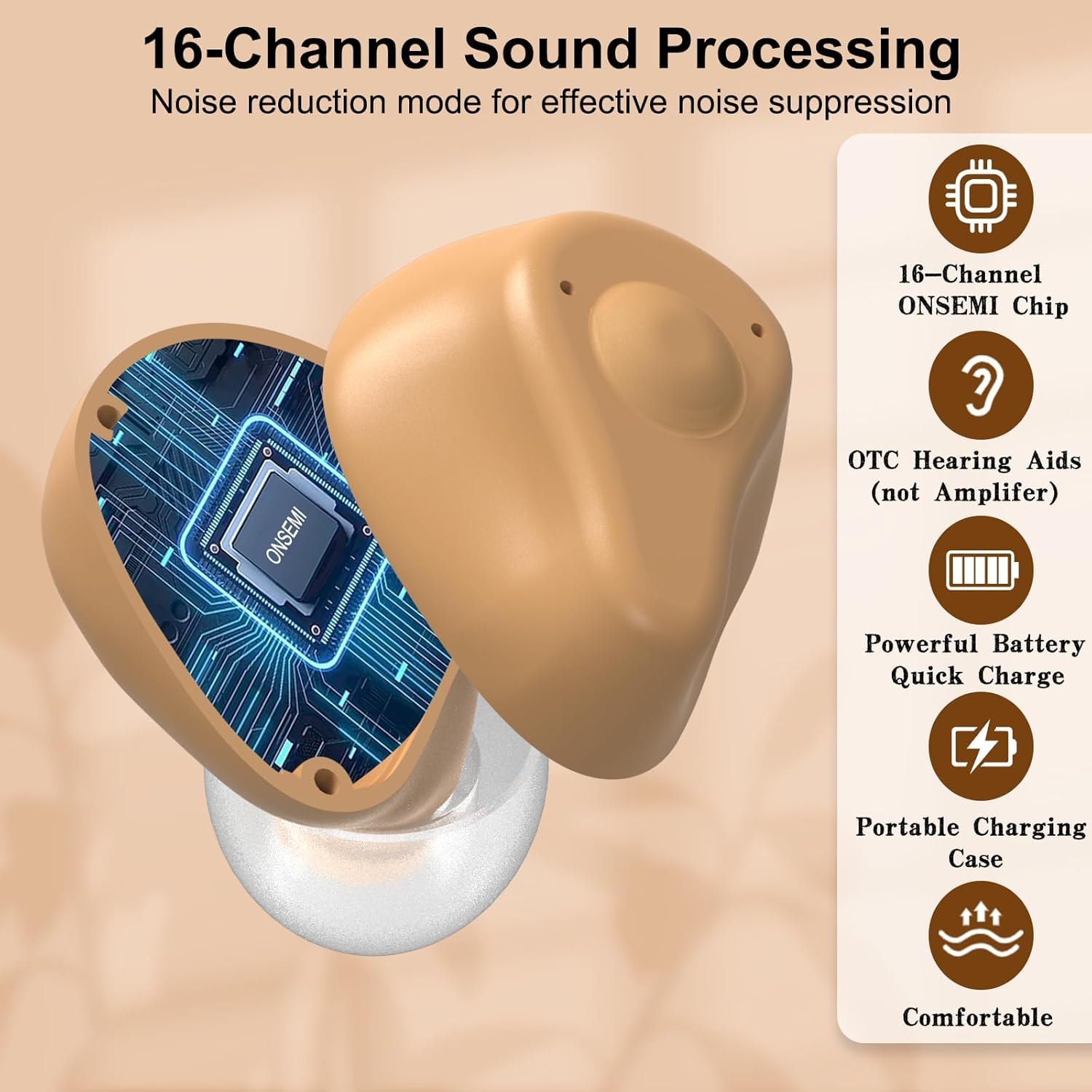 B0F21NG7GD, Experience the future of hearing with our advanced Intelligent Noise Reduction technology, delivering a peak sound gain of 37dB. Powered by the latest 16-channel digital processing and ONSEMI chip, our hearing aids capture and amplify even the subtlest sounds, ensuring crystal-clear speech and natural audio. Unlike traditional hearing aids with only 2-4 channels, our device