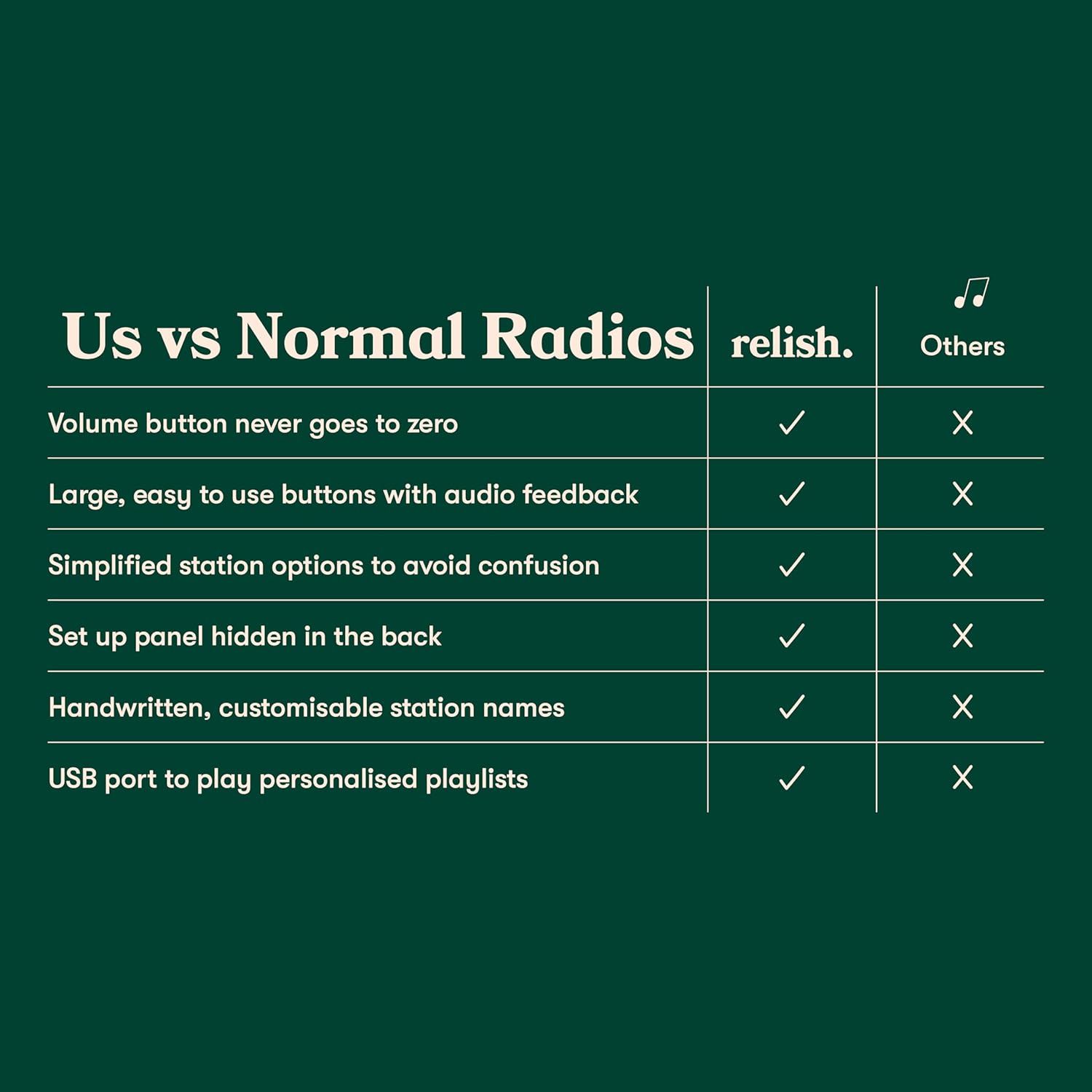 PERFECT GIFT – The Relish Radio is an ideal dementia-friendly gift for elderly relatives or friends. Music has the power to evoke memories, enhance focus, and bring joy, making this easy-to-use radio a thoughtful and meaningful choice. Designed with dignity in mind, there is no mention of dementia or Alzheimer's on the packaging.