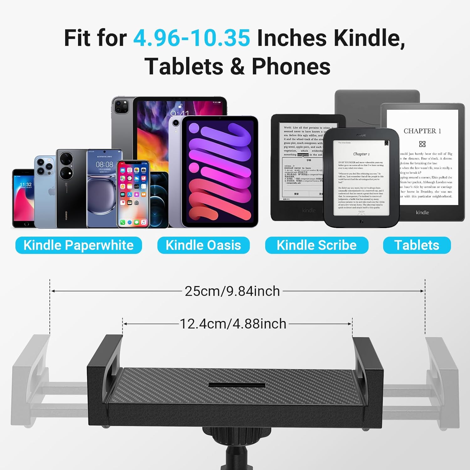 Review: Started using this a few days ago and so far it’s been a positive experience!Easy set up! The clamp is easy to mount – it has a firm hold and it’s made out of plastic with a rubber padding the does a good job in keeping the the clamped furniture unmarred.It’s surprisingly adjustable while staying sturdy – I’ve only mounted my kindle on it but the mounting springs open much wider!The page turner works as expected – nothing outstanding about it but highly appreciated as the real value in this would be the reading arm clamp!Would recommend to kindle owners!