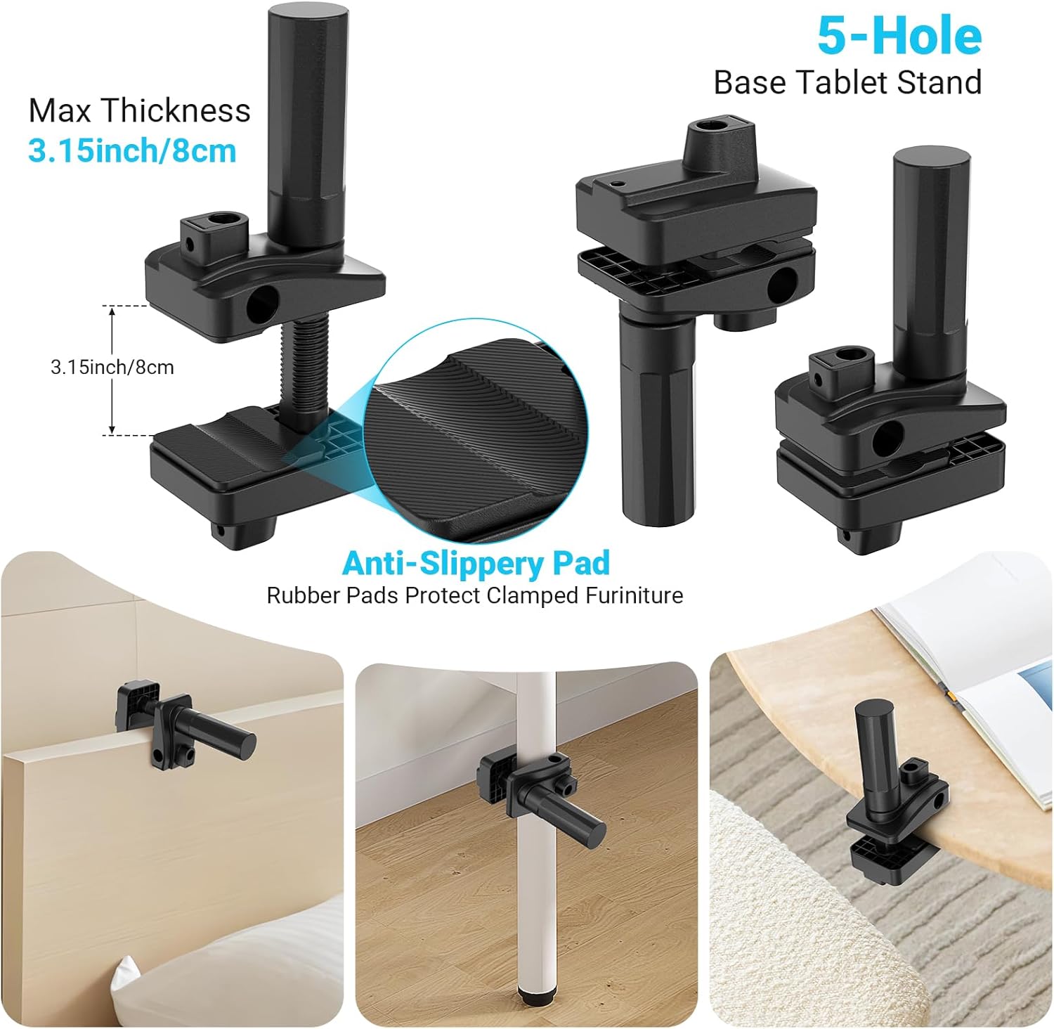Review: Overall it is exactly what I was looking for. I needed a stable mount for my projector for tracing the pictures. I wanted to make sure it can hold the projector without moving. It is actually perfect. I wish they could include also the table stand for extra versatility, because my table has a very little lip for the clamp. It handles the projector well. It also fits my phone and iPad securely as well. The arm is pretty long and you can turn your device all kinds of ways. I wish that the phone/pad holder was less slippery (not a problem with a lager device at all) and for some reason I can see some people are able to use the device on the leg/post. I was not able to put the arm into one of the side holes, only the adjustable ones on top or the bottom. It was too small. I cannot say about functionality of the page turner because I do not own a kindle and not planning to use it for reading. It was super easy to set up and I like the handle for the clamp-it is very easy to use, although it does stick out.