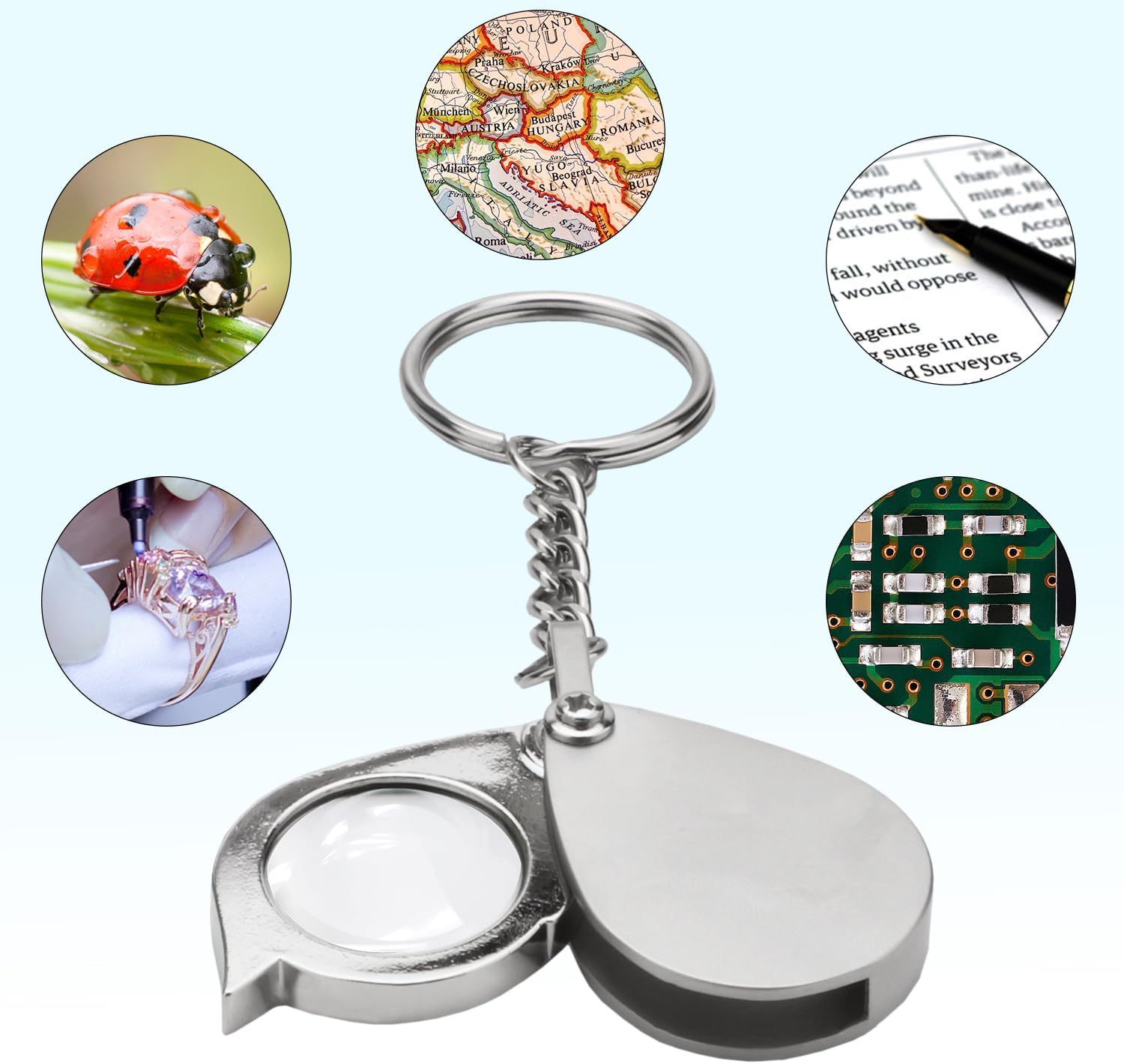 Compact and lightweight, this mini magnifier easily fits in your pocket or bag and comes with a keychain for effortless carrying.