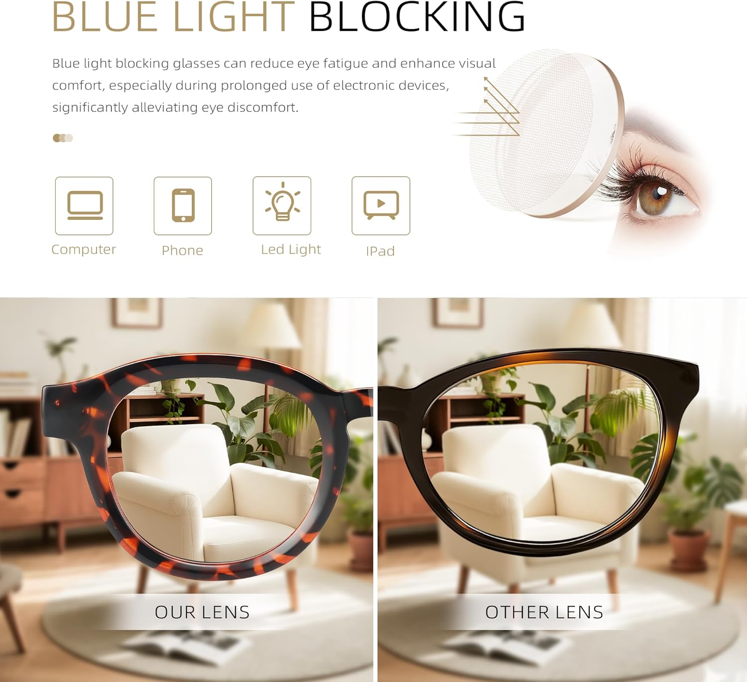 Review: Finding reading glasses that don’t just serve a purpose but also serve your style can be a challenge. That’s why I was pleased enough by the Reading Glasses for Women Anti Blue Light Readers.First Impressions:The classic round silhouette is flattering and lends an intellectual vibe that feels timeless. What sets them apart, however, are the thick frames. The frame feels more substantial than typical readers.Comfort for All-Day Wear (and Beyond)Despite the robust appearance of the thick frames, I was surprised by how comfortable to wear these glasses are. They feel lightweight enough on the face, and the fit is secure without being restrictive. I’ve worn them for extended periods – reading, working on my computer, and even just around the house – and never experienced any pinching or discomfort behind the ears or on the bridge of the nose. This is often an overlooked aspect of reading glasses, but it’s vital for daily use, and these deliver okay. The overall construction feels sturdy and well-made, suggesting they’ll hold up well to the rigors of everyday life.Functionality:Beyond their aesthetic appeal and comfort, these glasses are packed with practical features designed for modern living. As someone who spends a significant amount of time in front of screens (laptops, phones, e-readers), the anti-blue light technology has been nice to have. I’ve noticed a reduction in eye strain and fatigue, especially during long work sessions or late-night reading on a tablet. My eyes feel less tired and irritable by the end of the day, which has a positive knock-on effect on my overall comfort. The clarity for reading is good, and the anti-blue light tint is subtle enough not to distort colors, making them perfect for daily use.In conclusion, these Stylish Round Reading Glasses for Women are a decent investment for anyone seeking more than just basic readers. They blend design with essential eye protection and comfort.