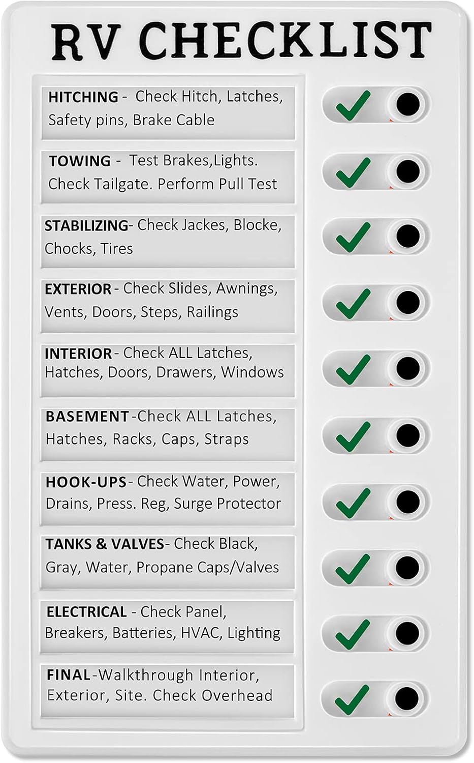 RV checklist: this portable memo board is designed for RV enthusiasts, and some important schedules are listed above, such as hitching-check hitch, latches, safety pins, brake cable and towing-test brakes, lights, check tailgate, perform pull test, to remind you not to forget the daily tasks; Whenever you complete a project, you can slide the button to turn the red cross into a green tick