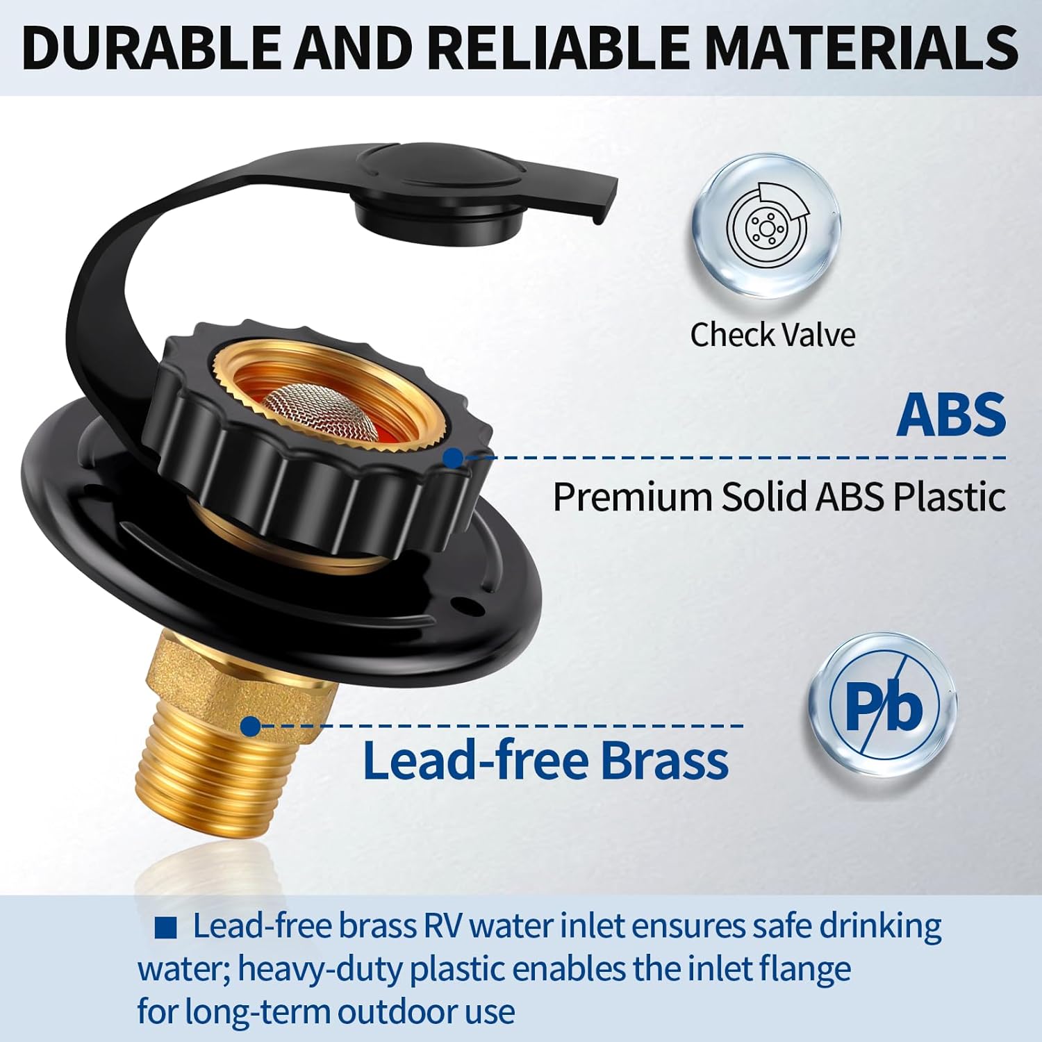 🛺Lead-free Brass Material: Our RV city water inlet valve is made with lead-free brass to ensure that your water remains safe to drink. The black flange is made of sturdy plastic, which makes it resistant to corrosion and frequent daily use. This check valve backflow preventer is durable enough to withstand high pressure and extreme temperatures, giving you peace of mind while on the road.