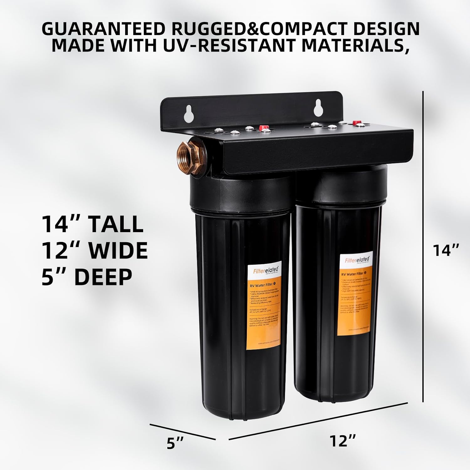 Filterelated RV Water Filter: Bipolar filtration, equipped with two filter cartridges and 3/4 brass fittings. It is perfectly compatible with RVs and can also be used for boat, whole house filtration, and under sink to improve your water quality