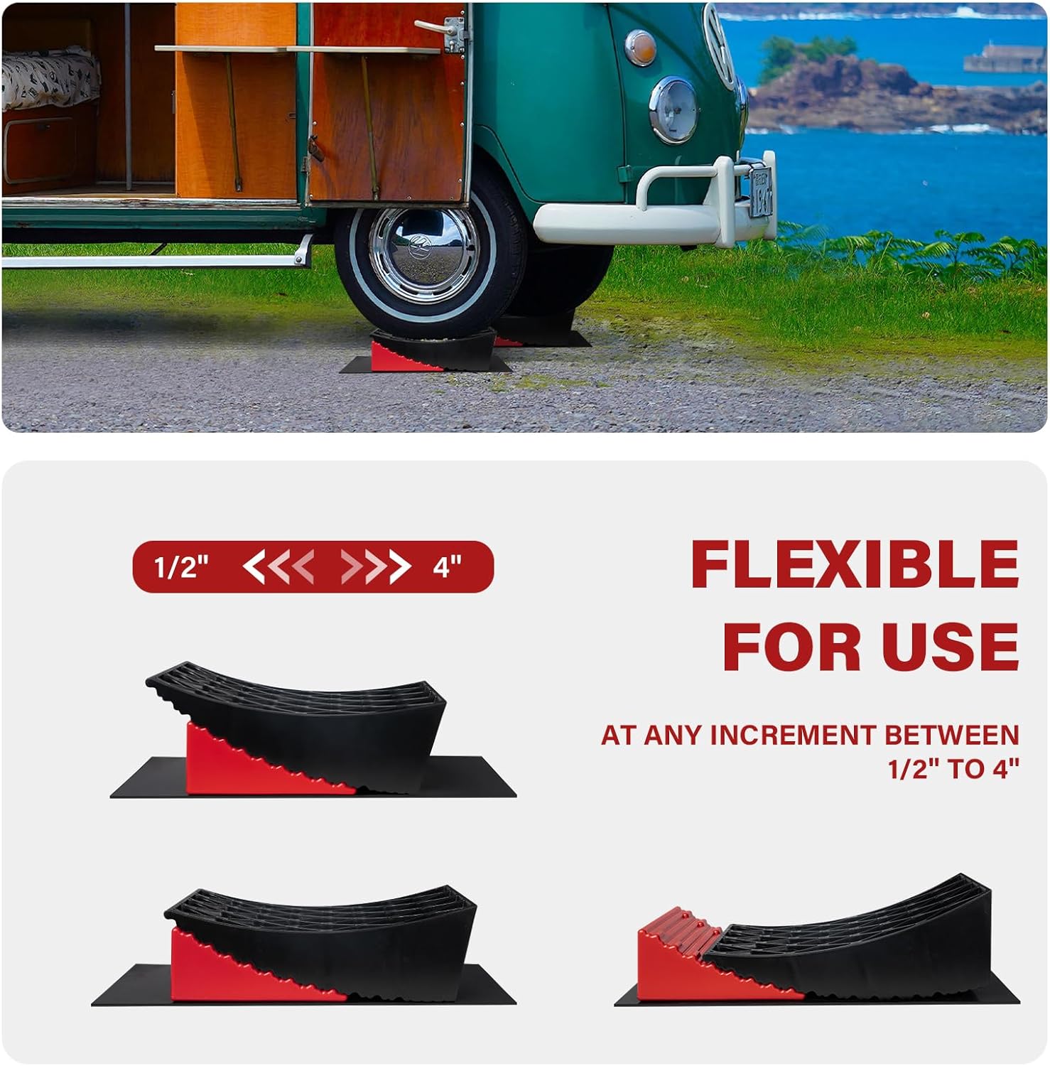 Quick & Accurate Leveling:Say goodbye to the hassle of stacking plastic or wood blocks. With Pawaday Camper Leveler System, you can easily and precisely level your trailer in increments of 1/2" and 4" within just 5 minutes. Simply drive your vehicle onto the curved leveler until it's level, secure it with the chocks, and you're done!