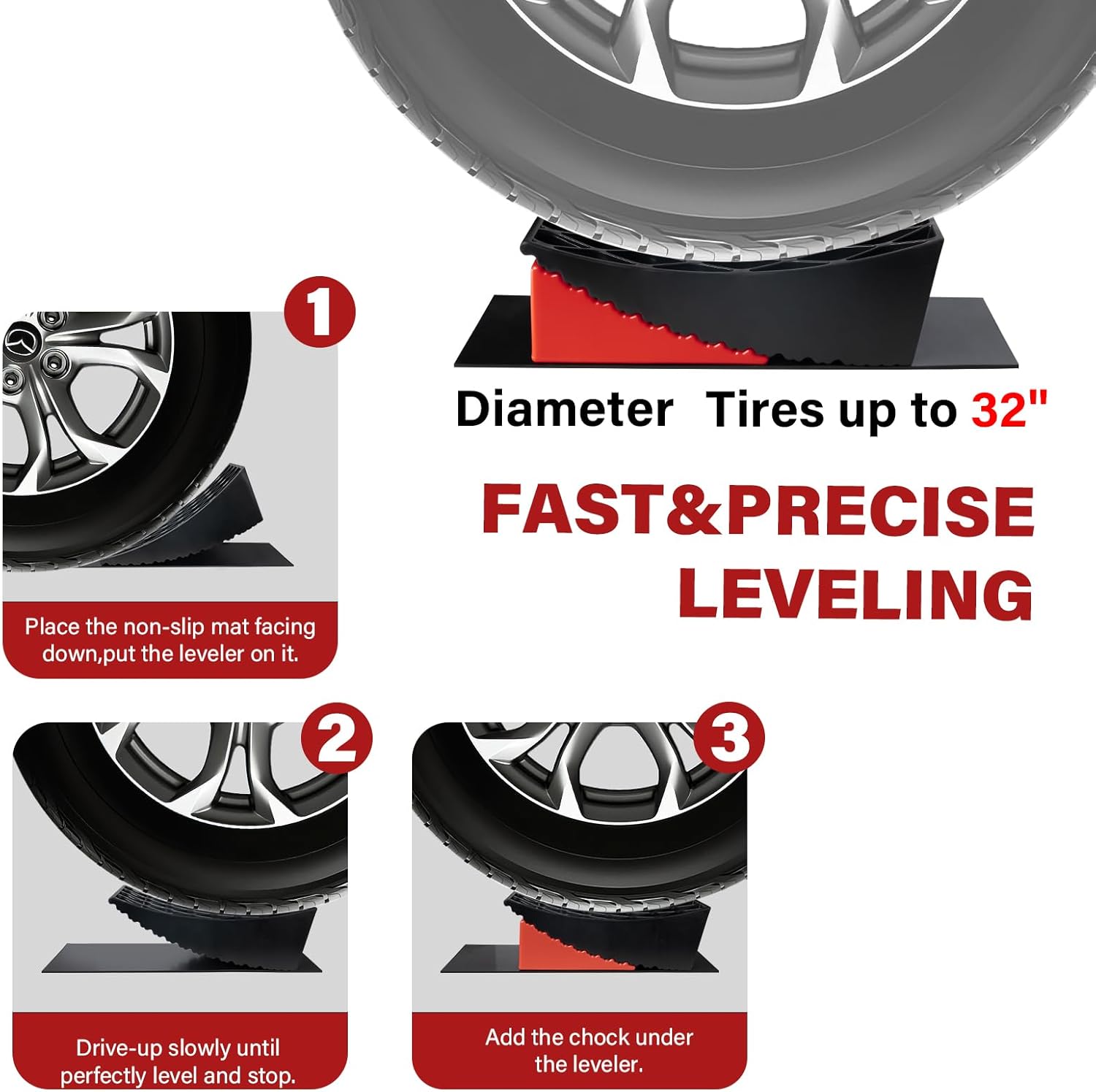 Heavy Duty Construction:Constructed with a high-performance polymer, our RV Leveling Blocks are built to last a lifetime. They can support any trailer weighing up to 35,000 lbs and accommodate tires up to 32" in diameter. Unlike other levelers made of HDPE or PP, our levelers won't break or compress under the weight of the trailer, providing you with a crucial security.