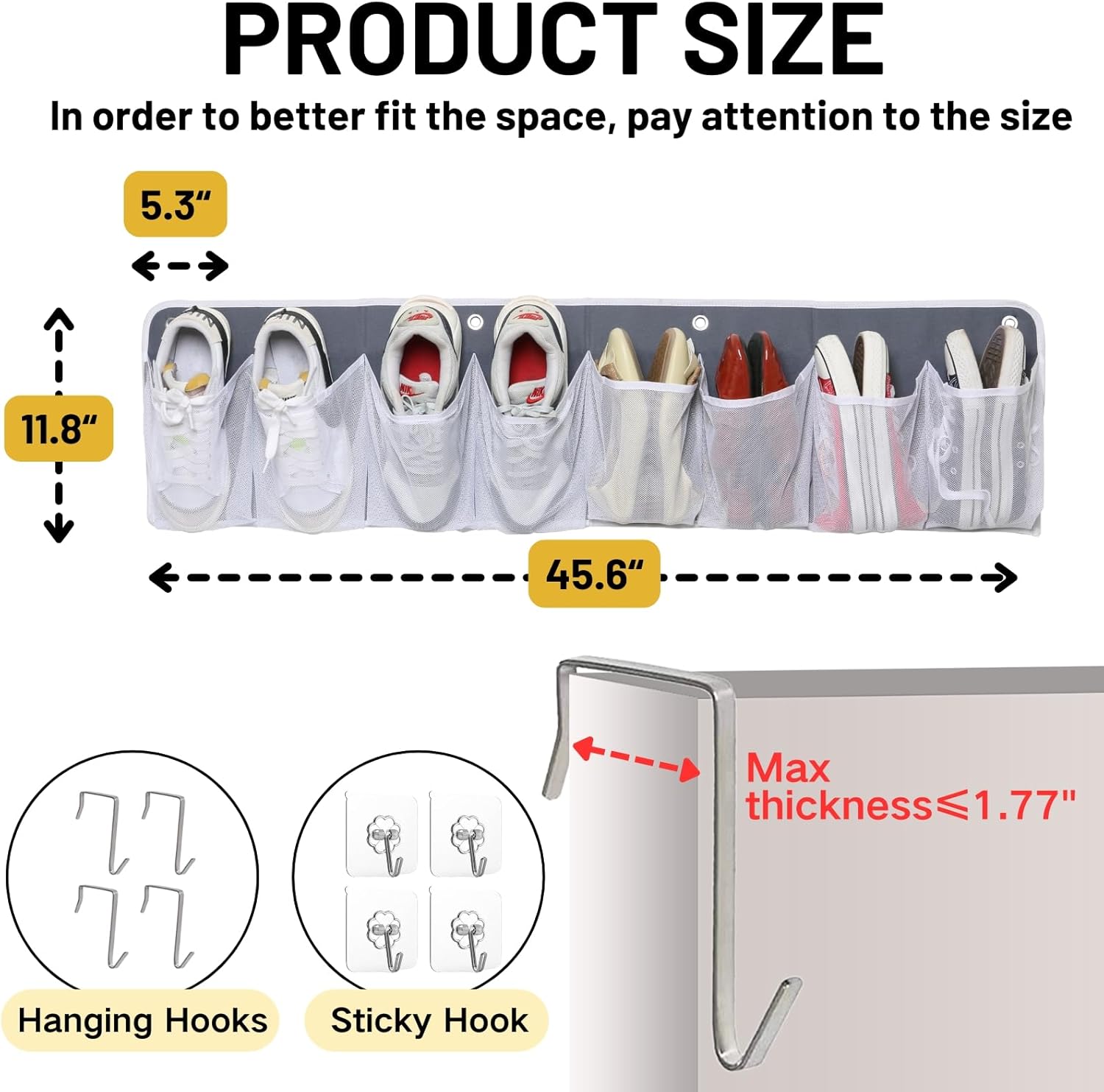 【16 POCKETS RV SHOE ORGANIZER】2 Packs, 16 pockets total, this RV storage solutions can meet all your need for RV organization! It can be hang beside your bed as a shoe holder, Maximum hook width ≤1.77''. Whole piece size: 45.6X11.8inch; Mesh Pocket : 5.3x8.8 inch.