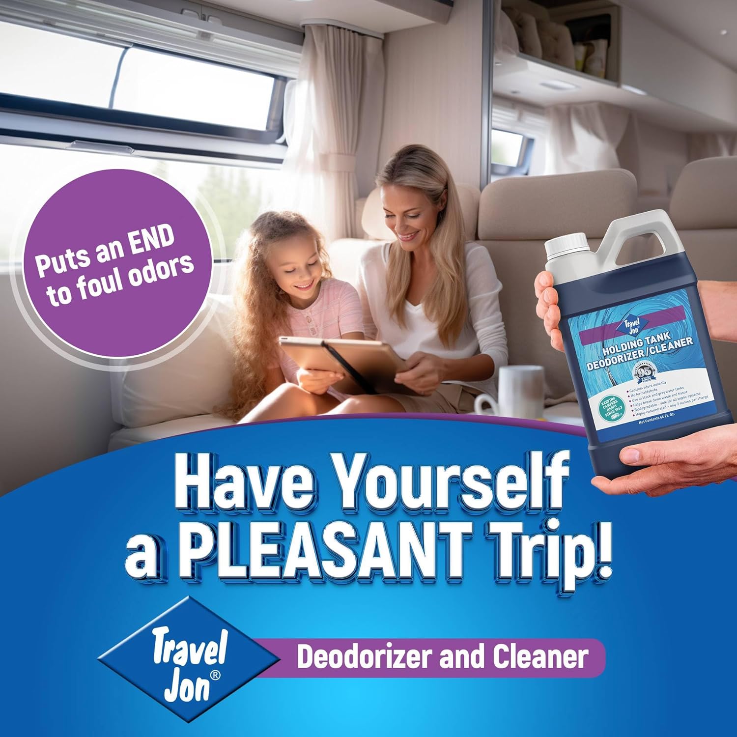 TOTAL ODOR CONTROL - Travel Jon RV waste tank treatment puts an END to foul waste tank odors. The RV tank deodorizer ensures a long-lasting, fresh, and clean scent. Enjoy a pleasant trip on the road, at the campsite, or at sea!