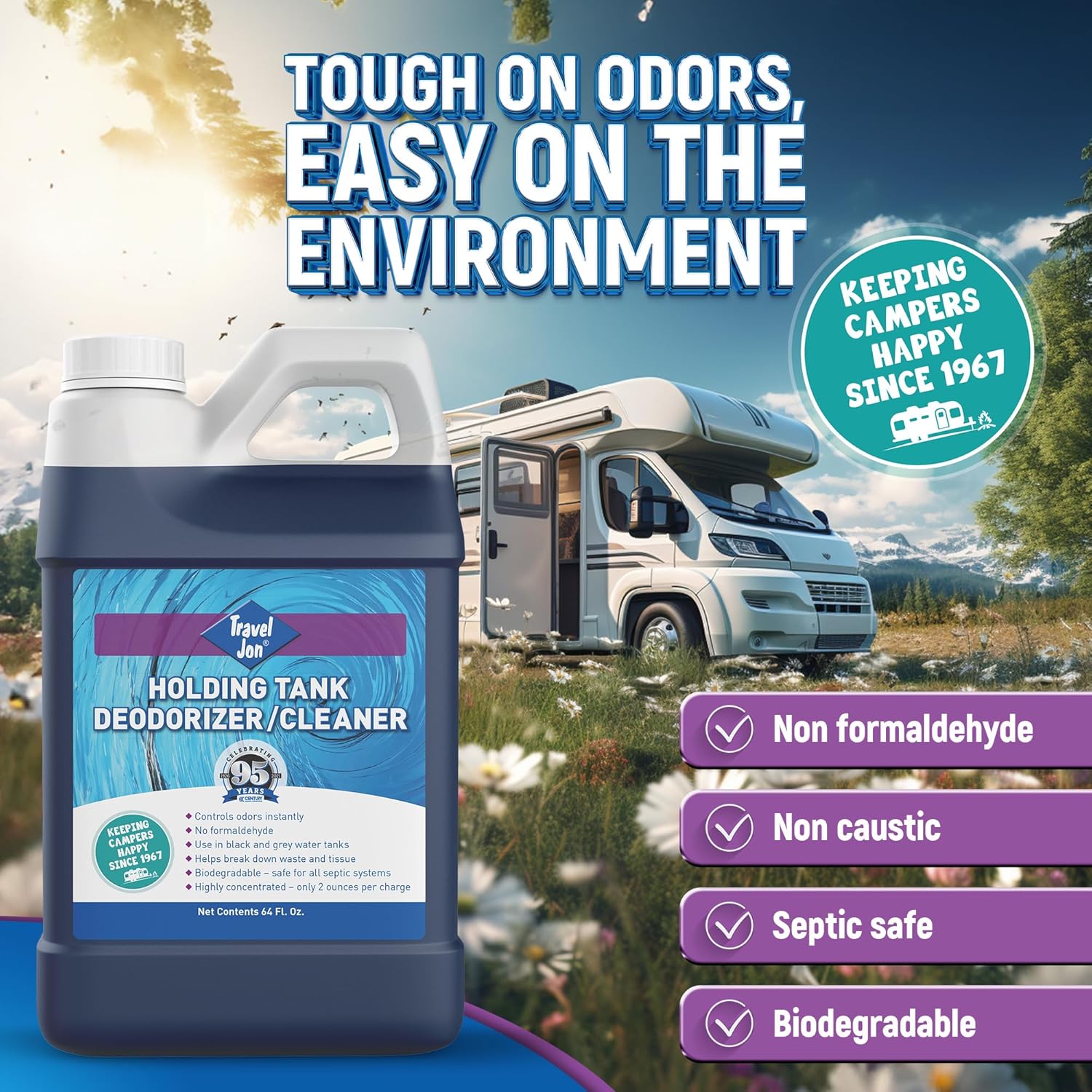 UNIVERSAL COMPATIBILITY - Travel Jon porta potty deodorizer is made in the USA and is approved as safe for all septic and municipal systems. Our camper toilet treatment comes in various sizes (8oz, 32oz, 64oz, and 1 gallon), and provides an effective and efficient solution for all your recreational and marine vehicle needs.