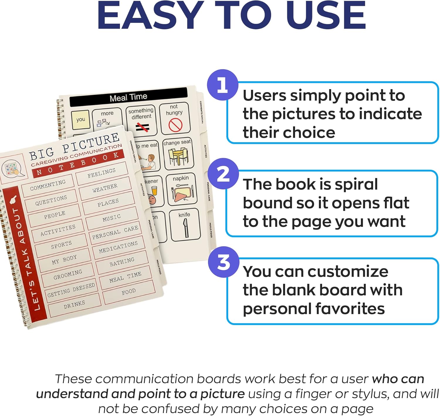 B07B8XF6BX, This original, comprehensive communication book takes the guesswork out of patient-caregiver communication. It can be tough to know what a person with speech limitations wants to convey. This unique communication book provides pictures and words that patients can use to express their feelings, thoughts, and needs to their loved ones or caregivers. This nonverbal communication device is designed for long-term use. Each book has 30 high-quality cardstock pages, and a spiral binding so it opens flat for easier use. Our Big Picture book contains over 330+ pictures with large print words in…, 4.5,