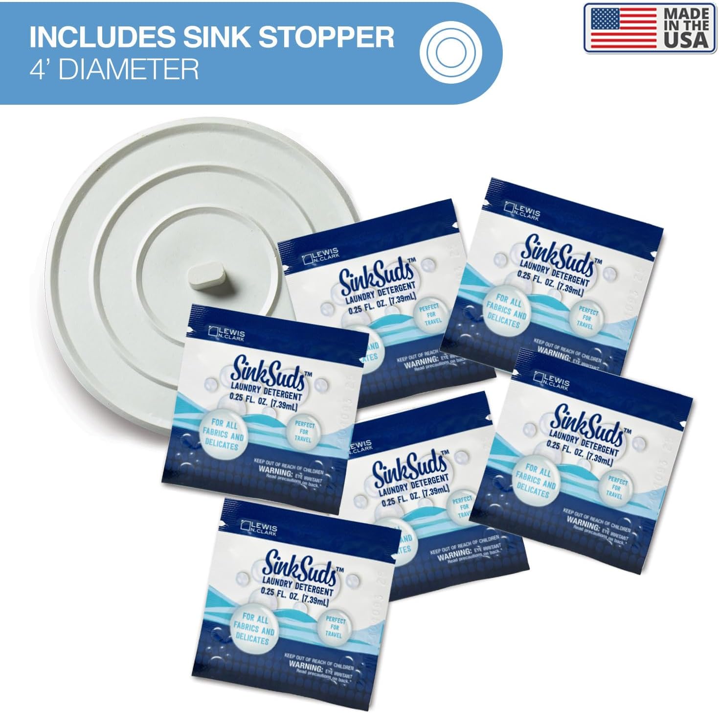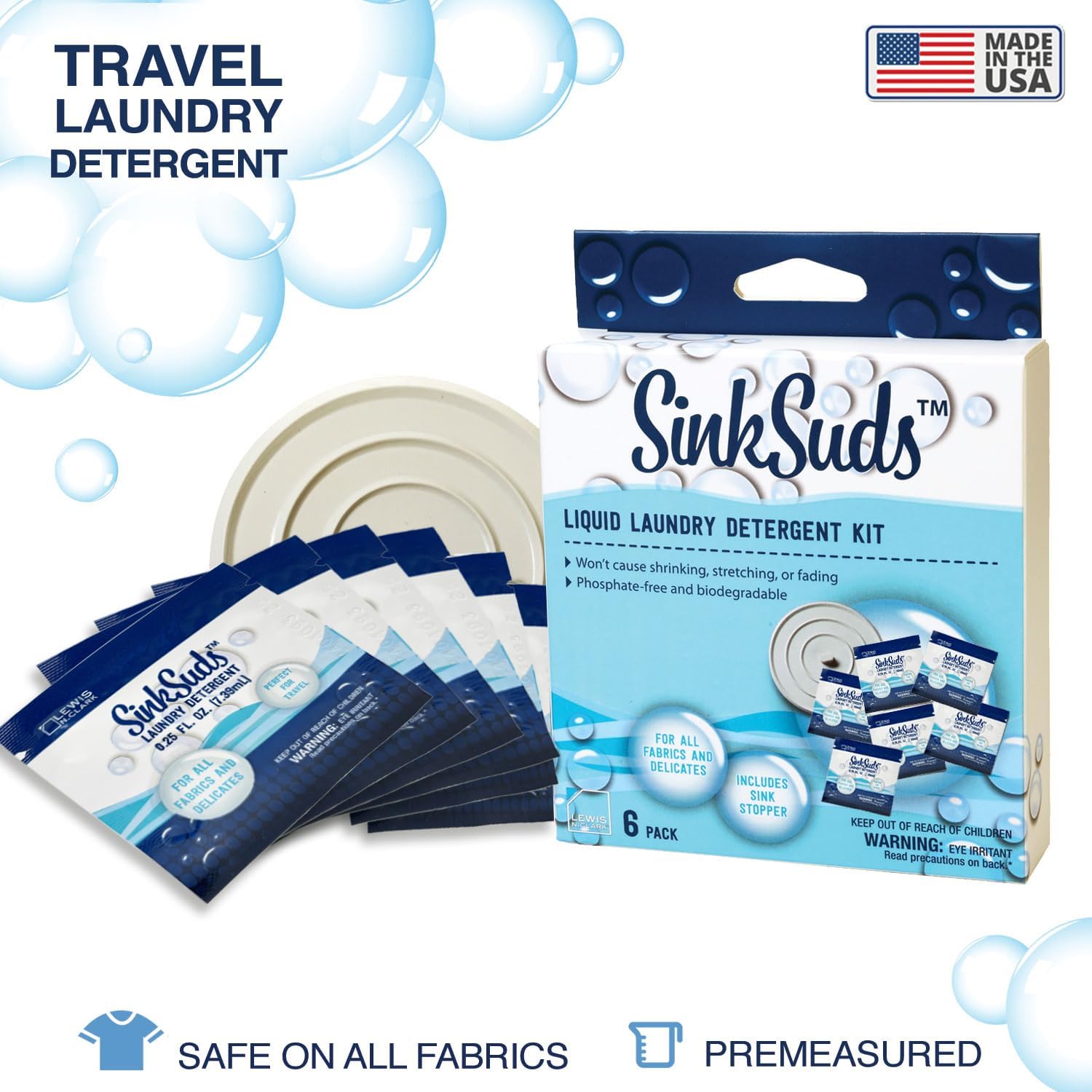 SINKSUDS, IT’S SIMPLE: Simply mix the packet in water, wash your garments, and hang dry; Use 1 packet for 2-3 garments and 4 packets for a full load of laundry; Includes 6 unscented, 0.25 fluid ounce packets and a sink stopper;