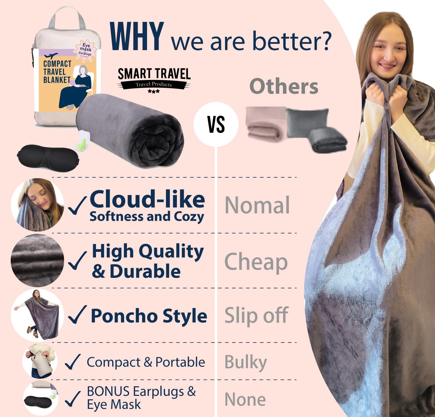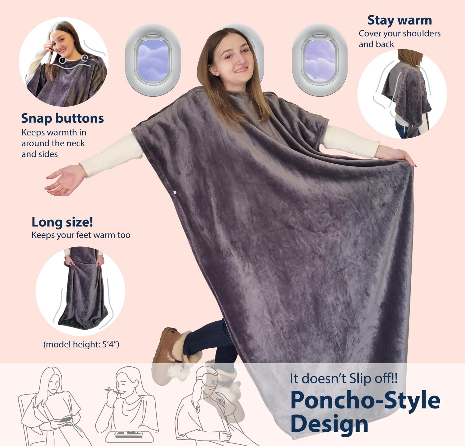 4."Smart Design, Maximum Comfort: Your Wearable Travel Blanket" The travel blanket has snaps on both sides of the neck and on both sides of the body, allowing you to wear it as a poncho style by slipping it over your neck.Designed not to slip off the shoulder, allowing you to wear pajama-style while sleeping or even while dining on the airplane.