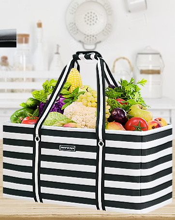 STAND UP REUSABLE GROCERY BAGS:The utility tote is ingeniously designed with a metal wire frame at the top opening, ensuring it remains open at all times. Pulling the utility tote bag out, it effortlessly stands on its own and maintains an upright position for an extended period. The bottom is thoughtfully crafted with a foldable bottom panel, preventing deformation even when loaded with items.