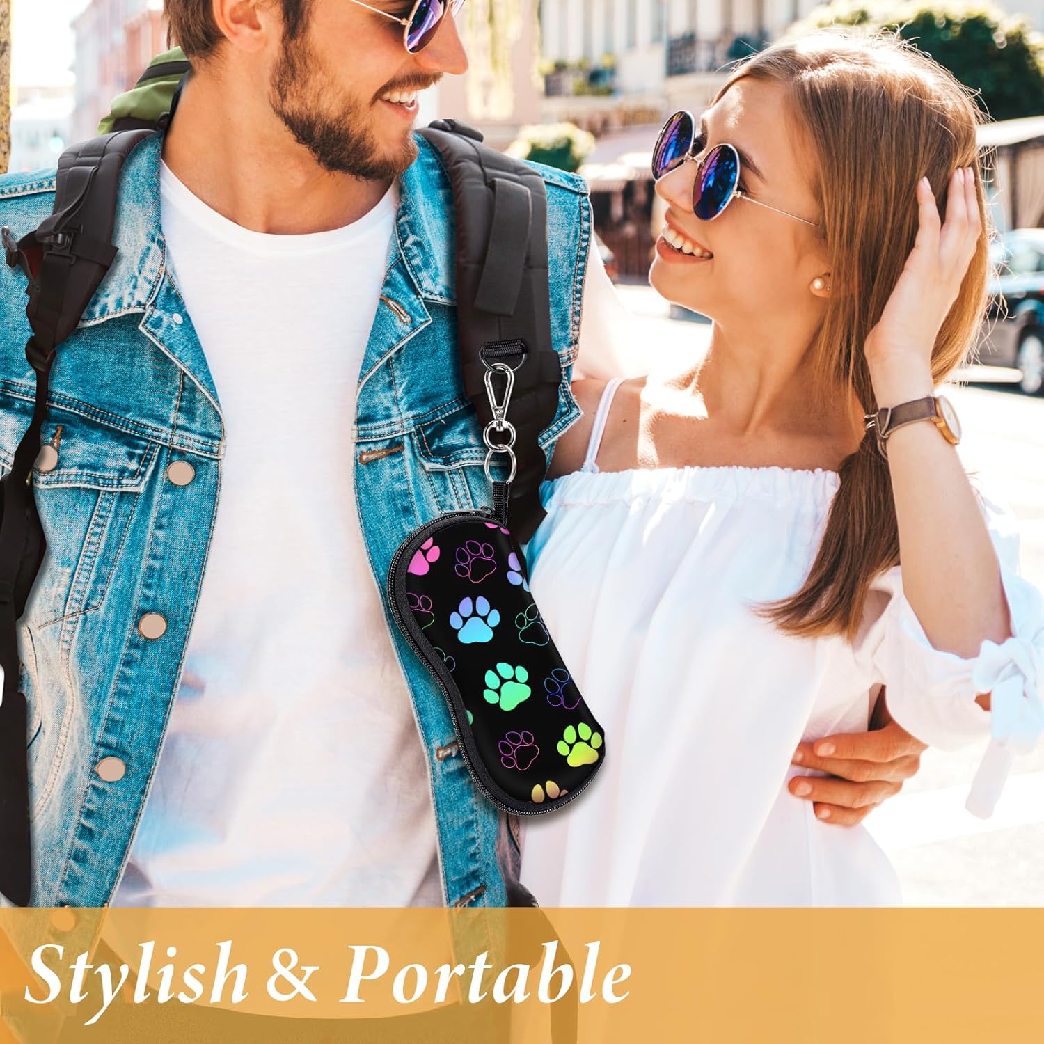 Review: These are great for clipping on a small cell phone crossbody or your beach bag. Keeps sunglasses handy and protects from scratches. Light weight and holds a large framed pair of sunglasses and still zips easily.