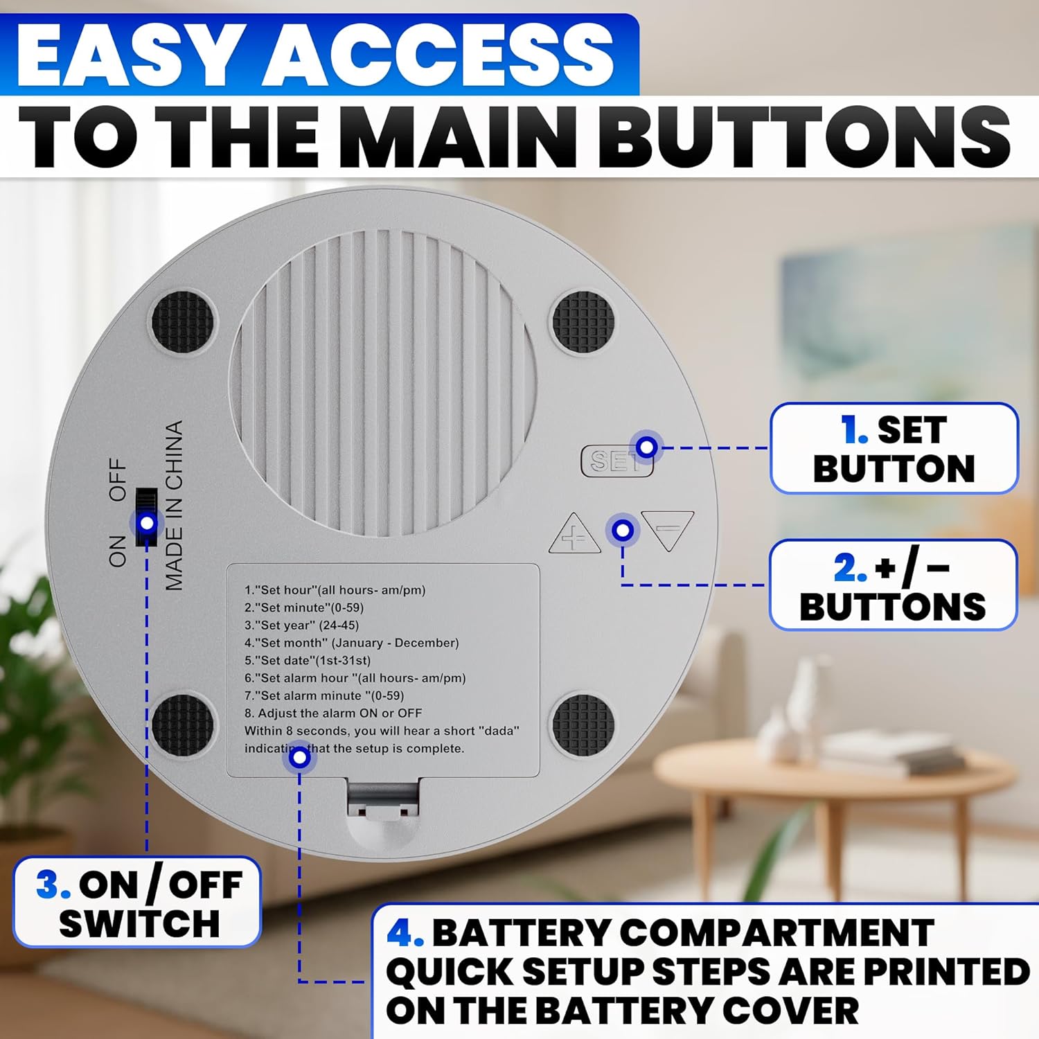 Review: Bought this talking clock to keep on my office desk and it works perfectly! I used to lose track of time and be late picking up my daughters from school. Now I just press the big button and it clearly says the time. The alarm is great too—never late again. Easy setup, good volume, perfect size. Highly recommend!