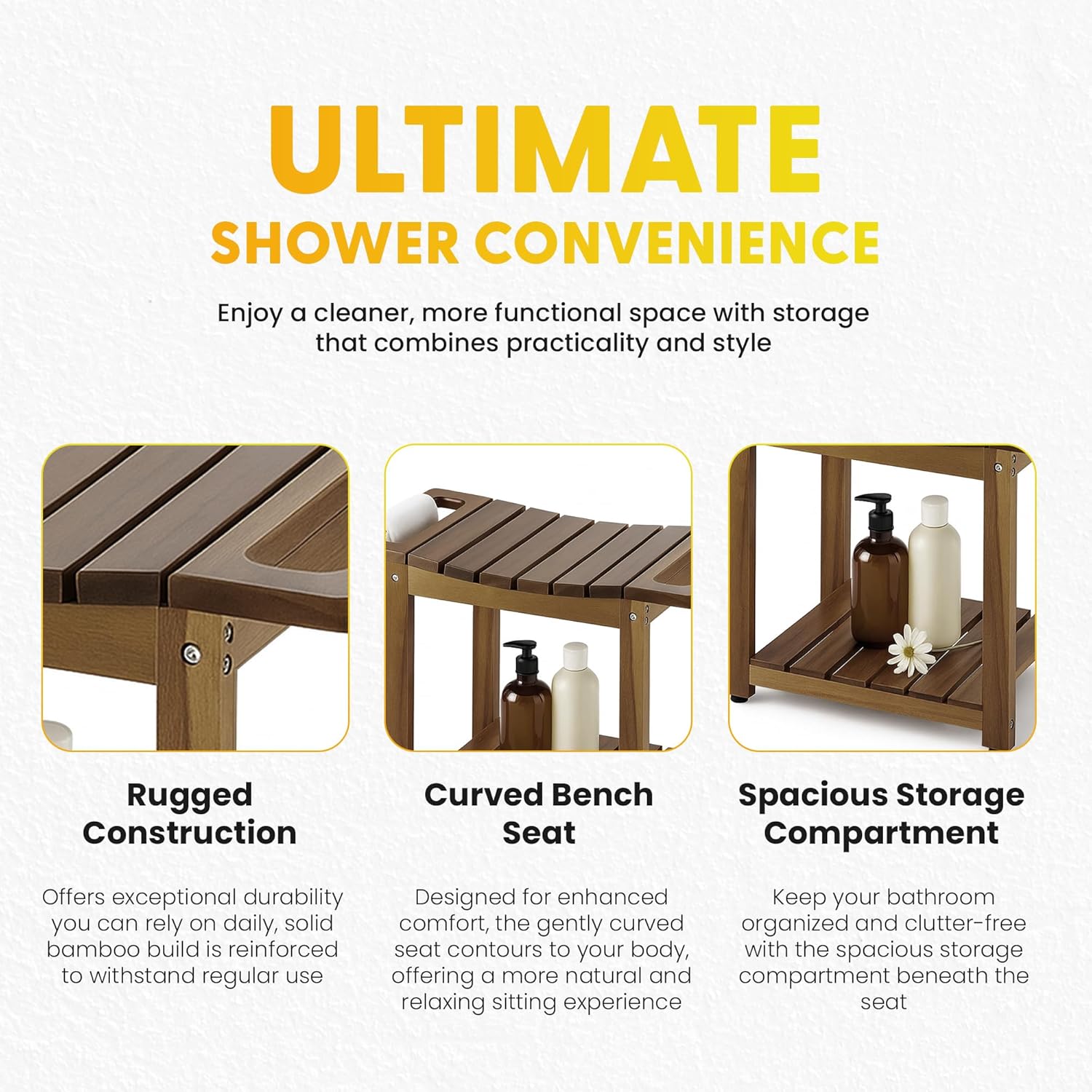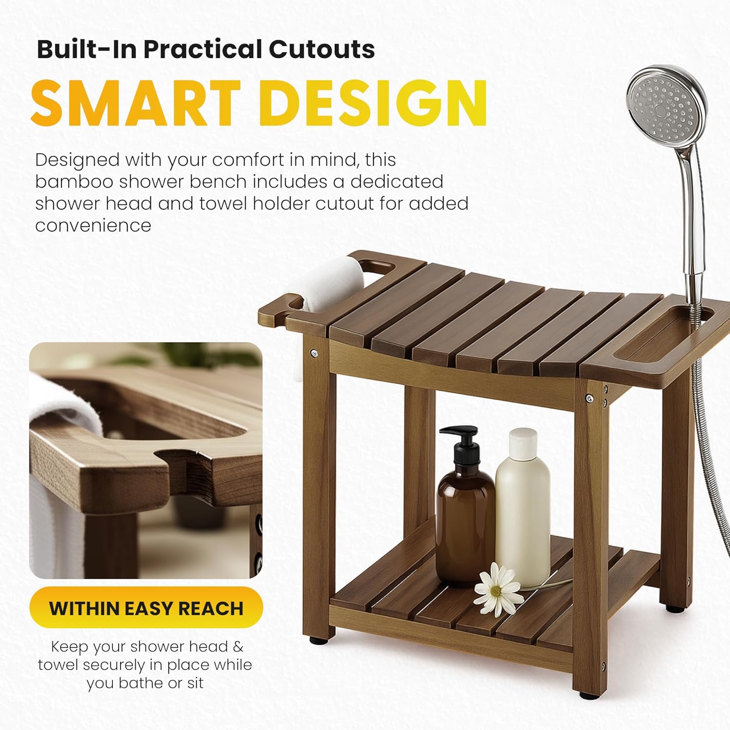 B0FB4Z8ZB6, Teak Shower Bench Chair with Storage Shelf, Bamboo Bathroom Stool for Inside Shower, Non Slip Seat, Bath Chair for Elderly, Lightweight Wooden Bench to Sit On