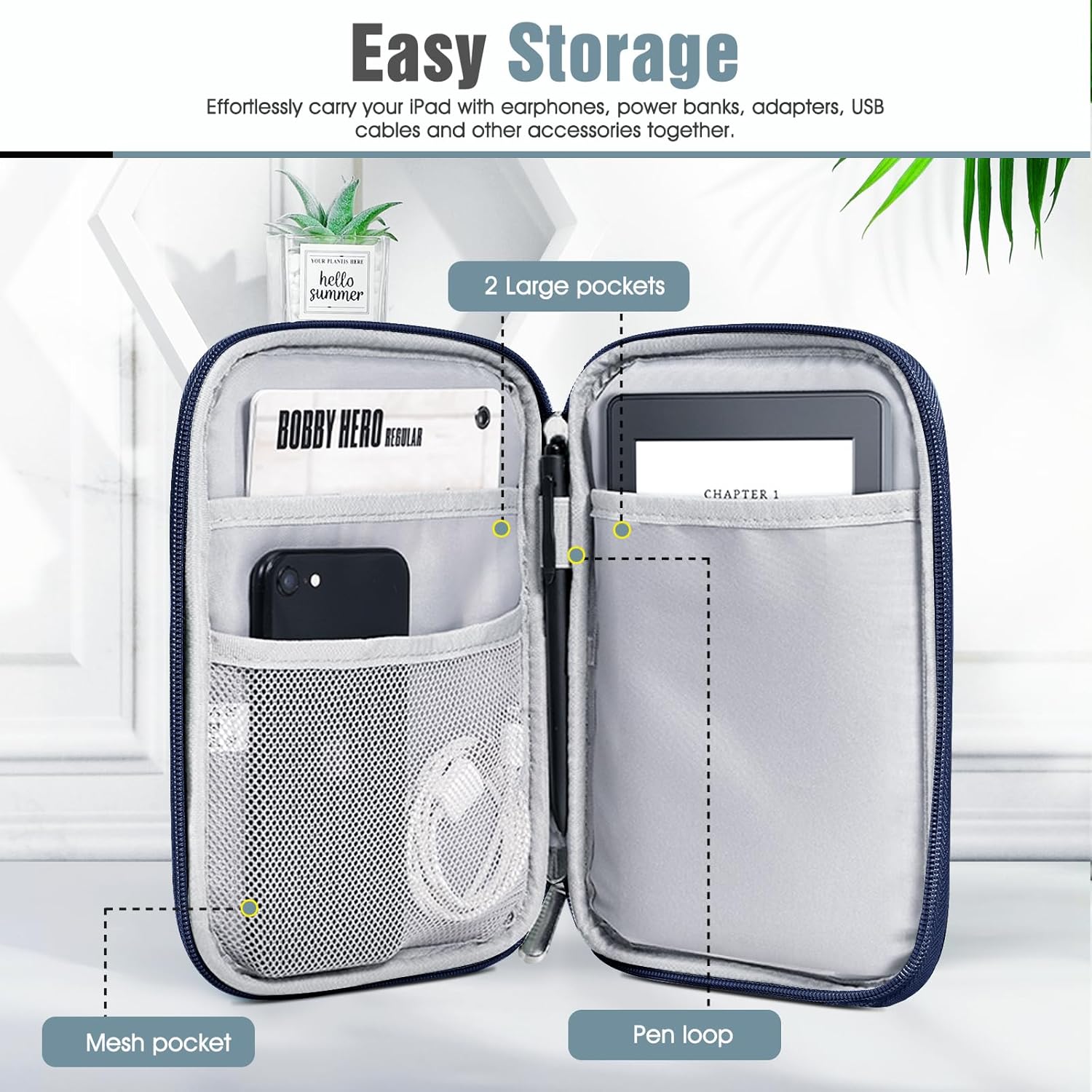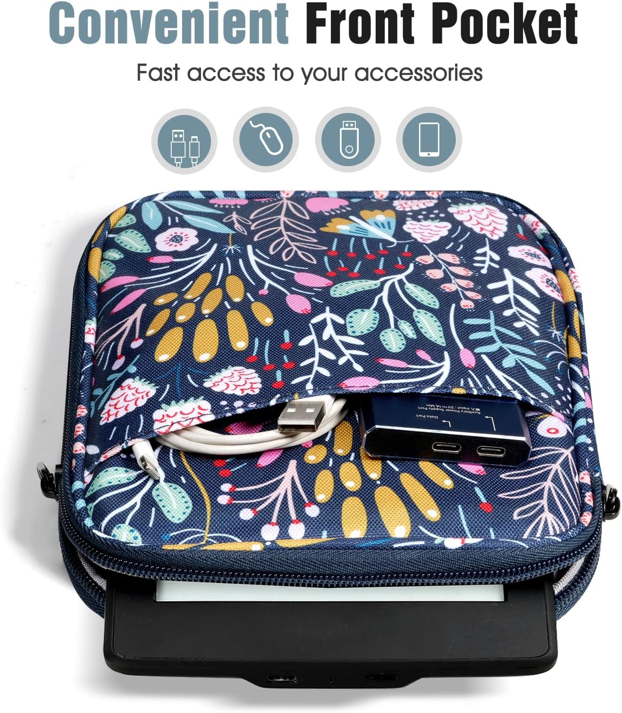 Review: This is a very nice case with a beautiful print of the forest. I wanted it for my kindle signature paperwhite 6.8 inch reader with a hope of fitting in my ipad mini 6 to carry both of them when on the go. After looking at the measurements of the case and my ipad (my kindle was guaranteed to fit), I took a chance and ordered it. So happy I did because they fit beautifully. The ipad HAS to be on the right side. It was positioned so that the screen is next to the padding. I didn’t want to chance cracking the screen with theKindle pressing on it. I had a thin clear silicon back only case with a pops it button. My kindle is on the left, having a thin case with a closing front cover . It turns it off when closed and also has a pops it button attached. I have the apple pencil in the holder and the automatic page turner in its pull string bag tied to the zipper pull. I slipped the knot thru the zipper hole and made a bigger knot to secure it in place. If you look close in the 1st pic I also have a stretch handle in the open front pocket. This handle will work for my ipad or my kindle. It saves hand and finger fatigue when using your screens for a long time. The zipper opens and closes easily and the case is not overstuffed. I hope this review helps with your decision on buying this great case.