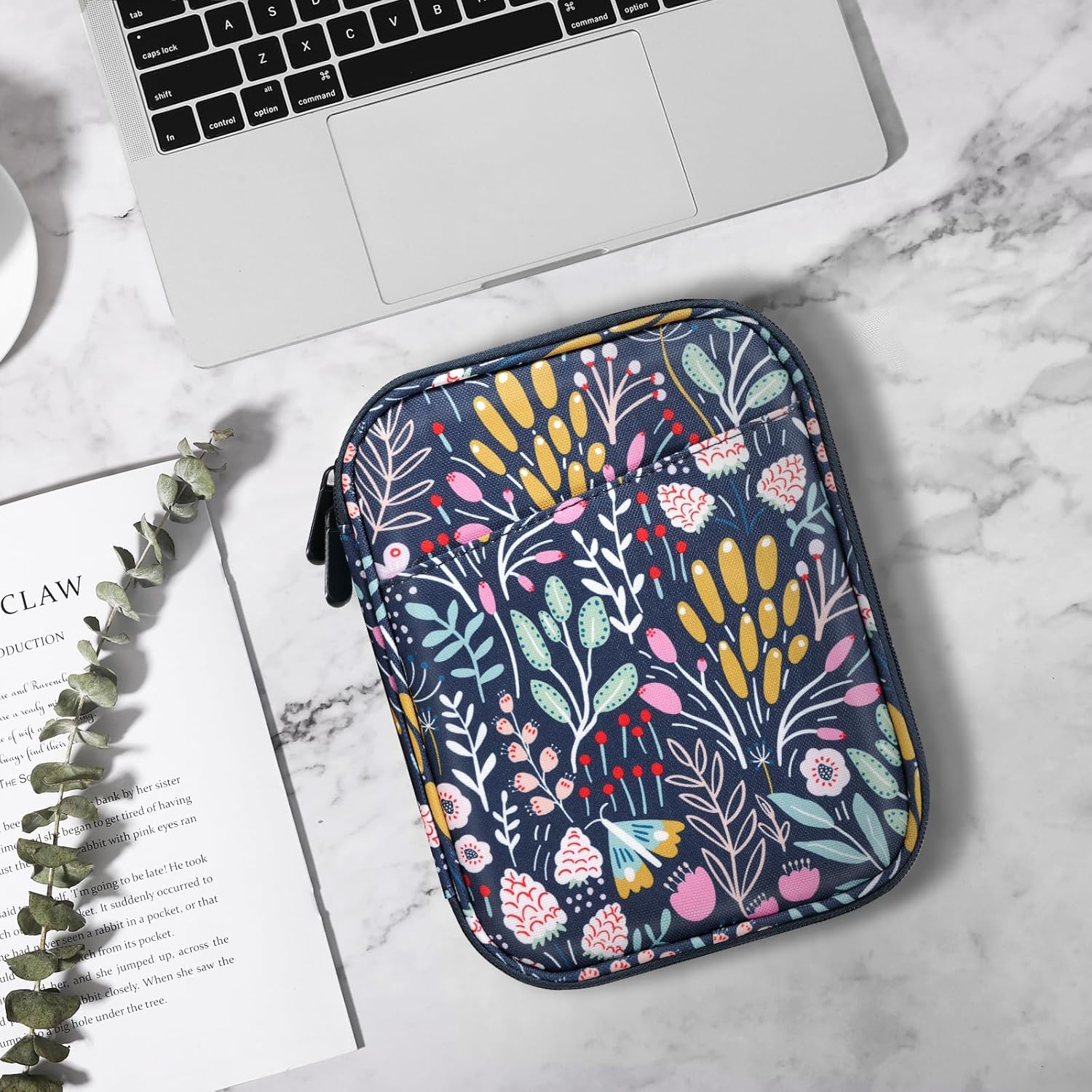Review: This is a very nice case with a beautiful print of the forest. I wanted it for my kindle signature paperwhite 6.8 inch reader with a hope of fitting in my ipad mini 6 to carry both of them when on the go. After looking at the measurements of the case and my ipad (my kindle was guaranteed to fit), I took a chance and ordered it. So happy I did because they fit beautifully. The ipad HAS to be on the right side. It was positioned so that the screen is next to the padding. I didn’t want to chance cracking the screen with theKindle pressing on it. I had a thin clear silicon back only case with a pops it button. My kindle is on the left, having a thin case with a closing front cover . It turns it off when closed and also has a pops it button attached. I have the apple pencil in the holder and the automatic page turner in its pull string bag tied to the zipper pull. I slipped the knot thru the zipper hole and made a bigger knot to secure it in place. If you look close in the 1st pic I also have a stretch handle in the open front pocket. This handle will work for my ipad or my kindle. It saves hand and finger fatigue when using your screens for a long time. The zipper opens and closes easily and the case is not overstuffed. I hope this review helps with your decision on buying this great case.