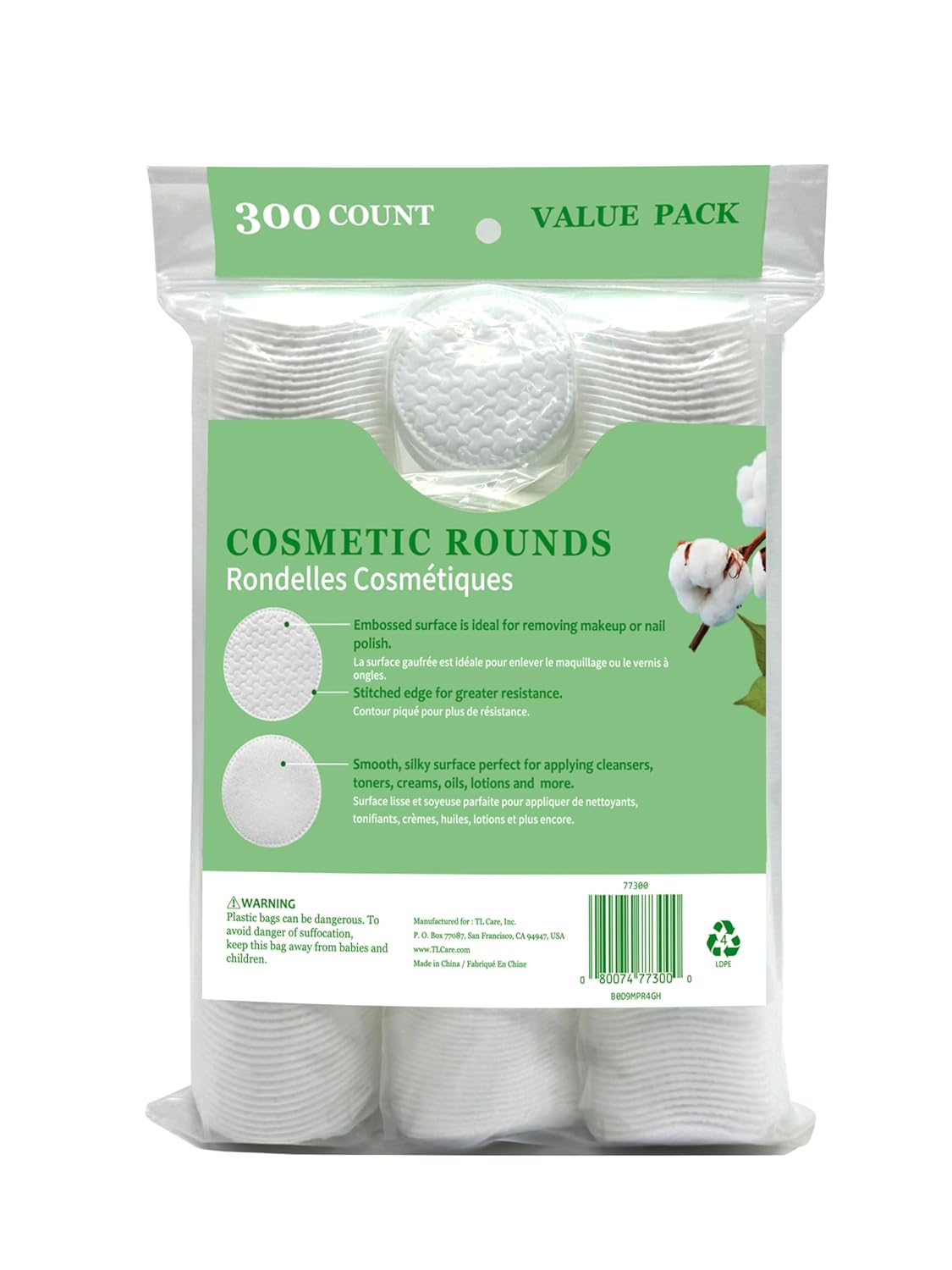 Includes 300 premium cotton rounds (2 bags of 100 counts + 1 bag of 90 counts + 1 travel canister of 10 counts )