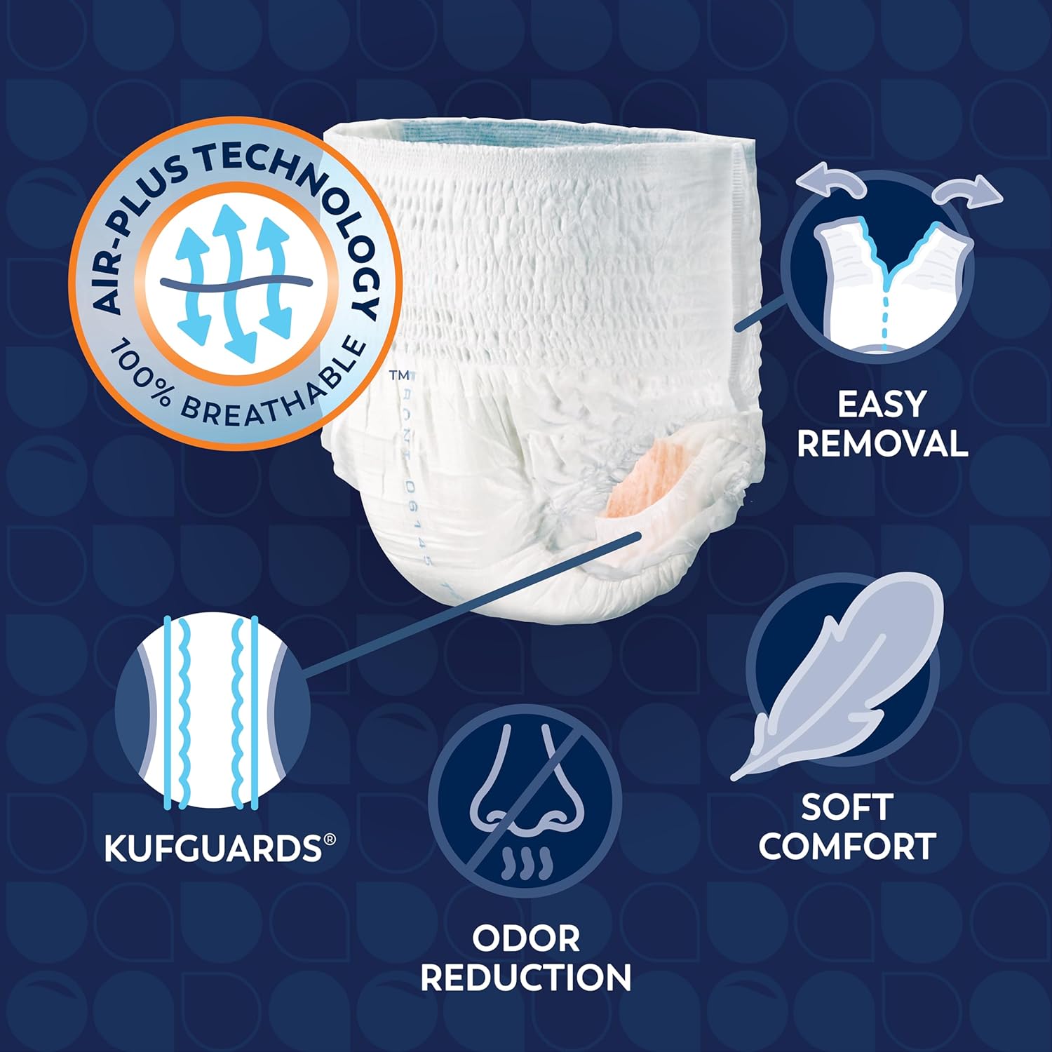 Review: Holds a lot of fluid, but what makes it my preference is that it has a quicker catch capacity for gushes with less overflow then I’ve found with other similar pull-ups that I’ve tried. Size of pull-up, Durability, thickness & length of pad part are good, especially for overnight. No trouble from skin irritation.
