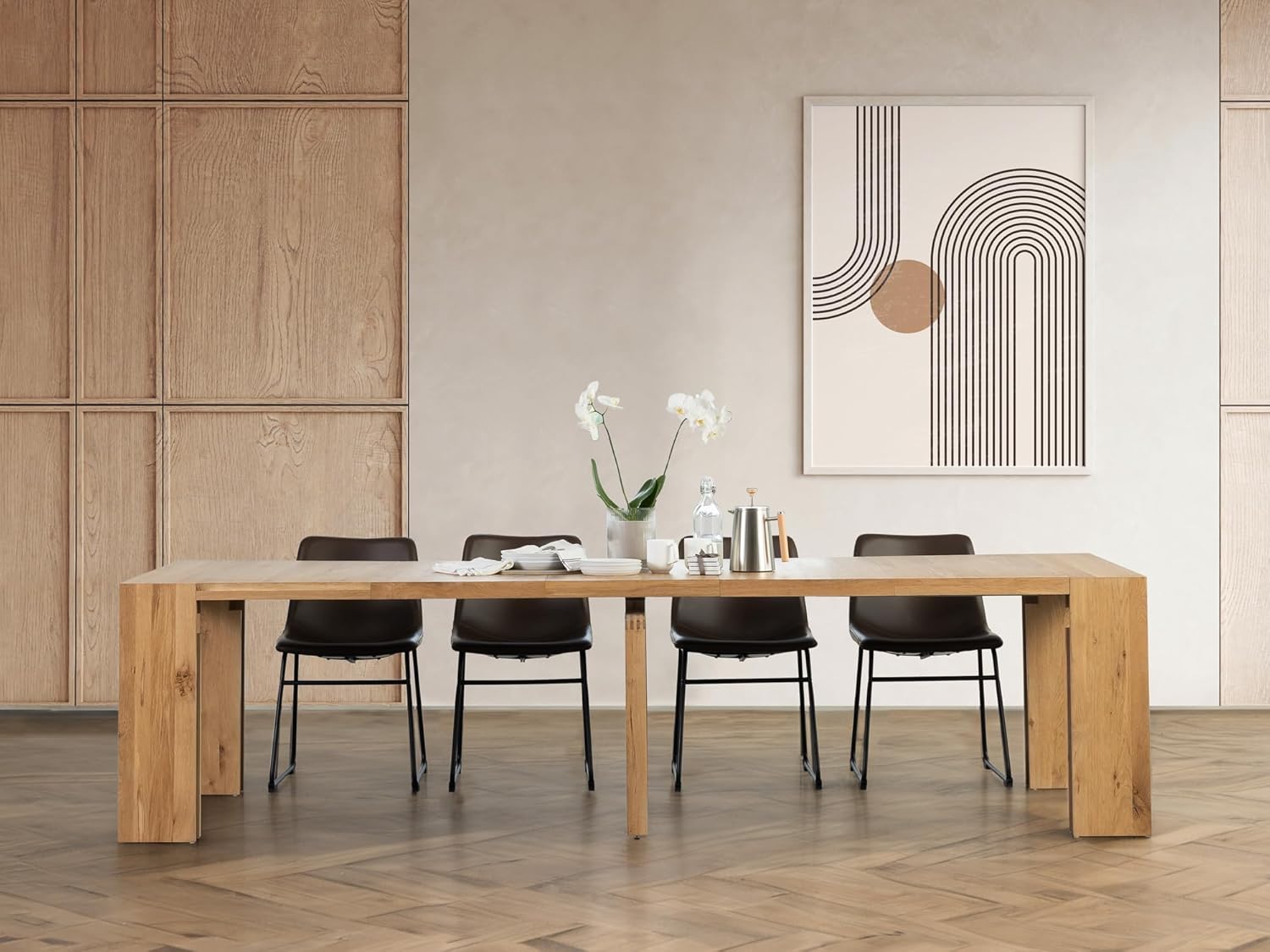 Review: This is a beautiful, well made and sturdy table! It looks beautiful in our home and we love that it’s adjustable up to a 12. One downside, when only putting in one leaf we could not fit two chairs on one side even though there was a gap. We had to add another leaf. Regardless it’s a beautiful table. Strongly recommend.