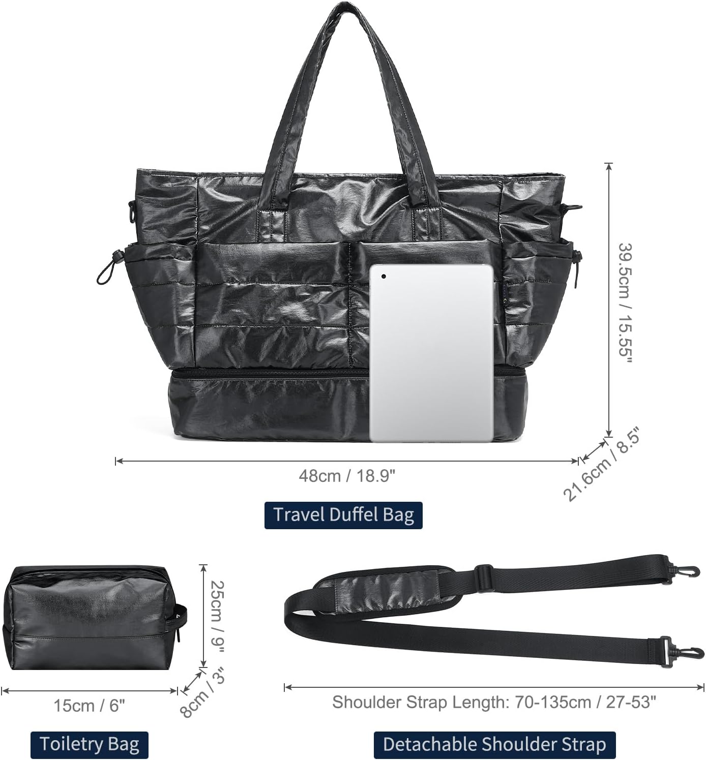 -Travel Duffel Bag+Seperate Toiletry Bag-- This travel bag with shoe compartment for women comes with a toiletry bag to store your cosmetics/toiletries. The travel bag size is 18.9 x 8.5 x 15.55 inch / 48 x 21.6 x 39.5 cm. The travel bag capacity is 50L. The Toiletry Bag size is 9 x 3 x 6 inch / 25 x 8 x 15 cm. The Hand Strap Height is 11.8 inch / 30 cm. The Shoulder Strap Length is 27-53 inch /70 - 135 cm.